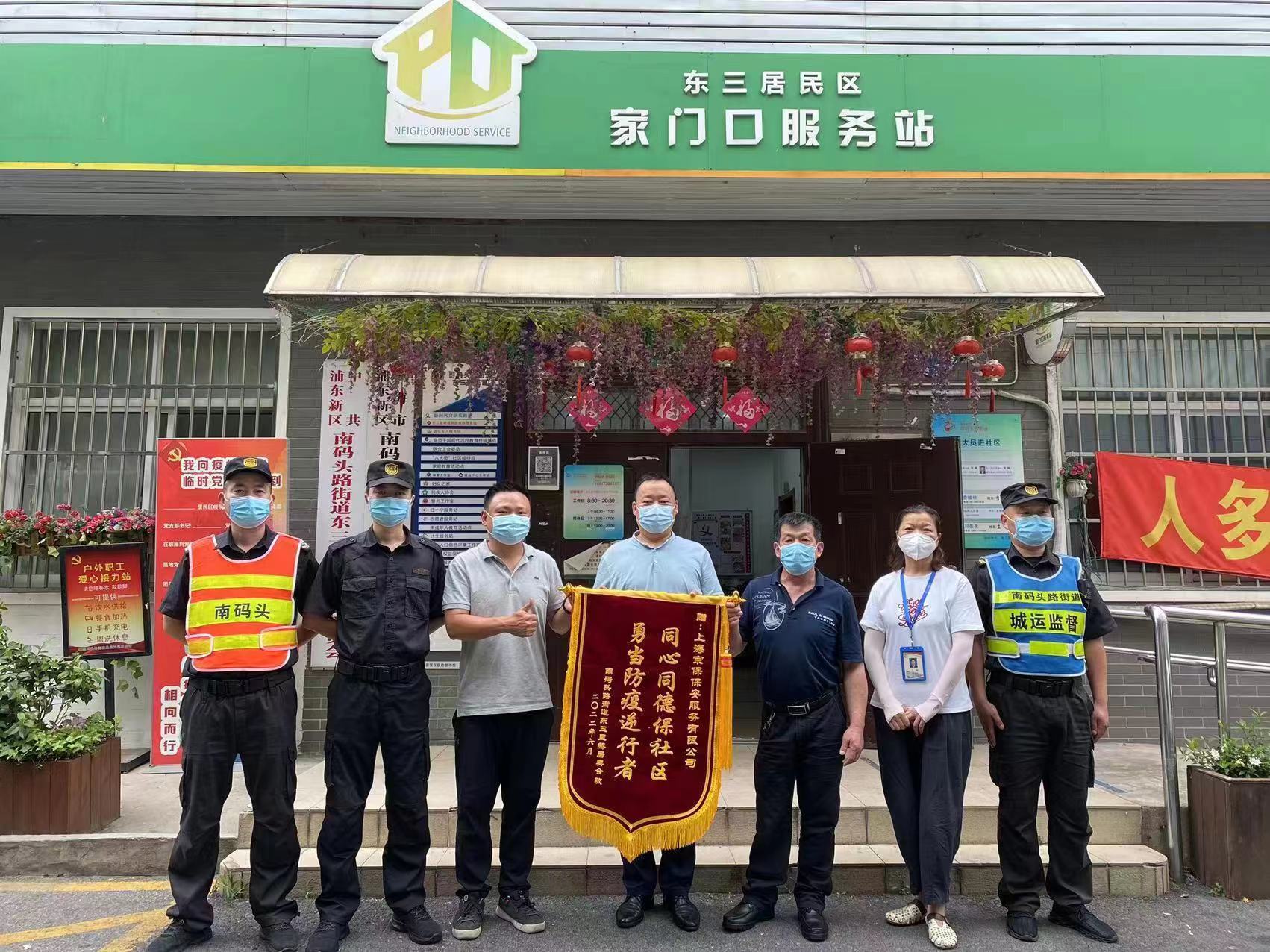 6月13日,南碼頭路街道東三里橋居委將一面繡有“同心同德保社區 勇當防疫逆行者”的錦旗和一封感謝信送到宗保公司駐東三居民區項目,衷心感謝公司員工在疫情防控工作中的不懈努力和辛勤付出。