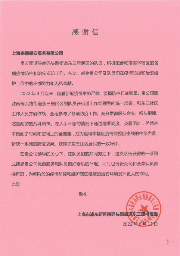 一面錦旗、一封感謝信,見(jiàn)證了宗保員工共克時(shí)艱、抗擊疫情的風(fēng)采,展現了宗保員工同心同德、勇往直前的擔當。在常態(tài)化疫情防控形勢下,宗保員工將再接再厲、持續努力,以更加扎實(shí)的工作作風(fēng)、更加認真的工作態(tài)度、更加嚴格的工作要求,配合開(kāi)展好社區居委的疫情防控工作,為助力筑牢東三里橋疫情防控屏障貢獻自己的力量。