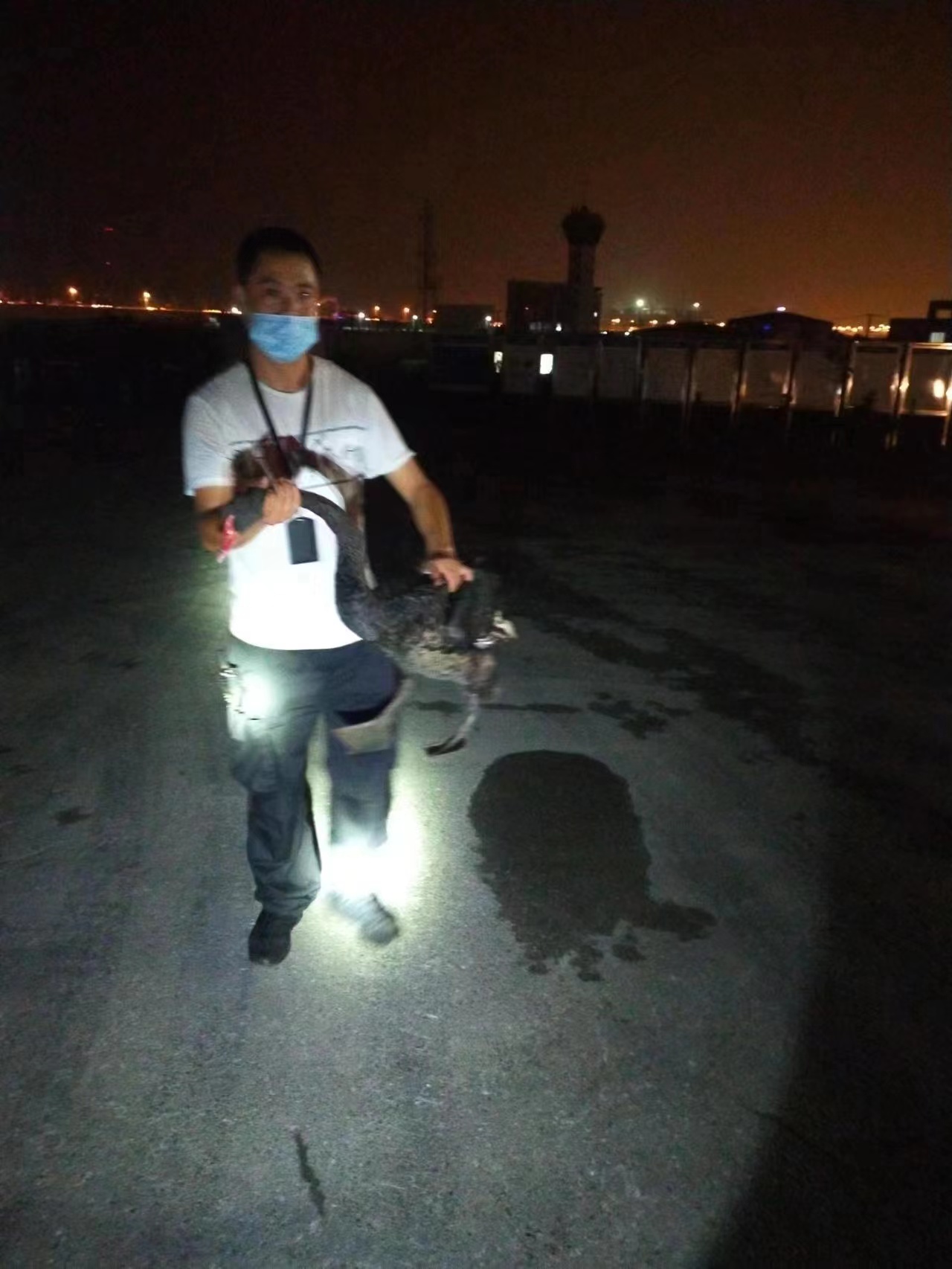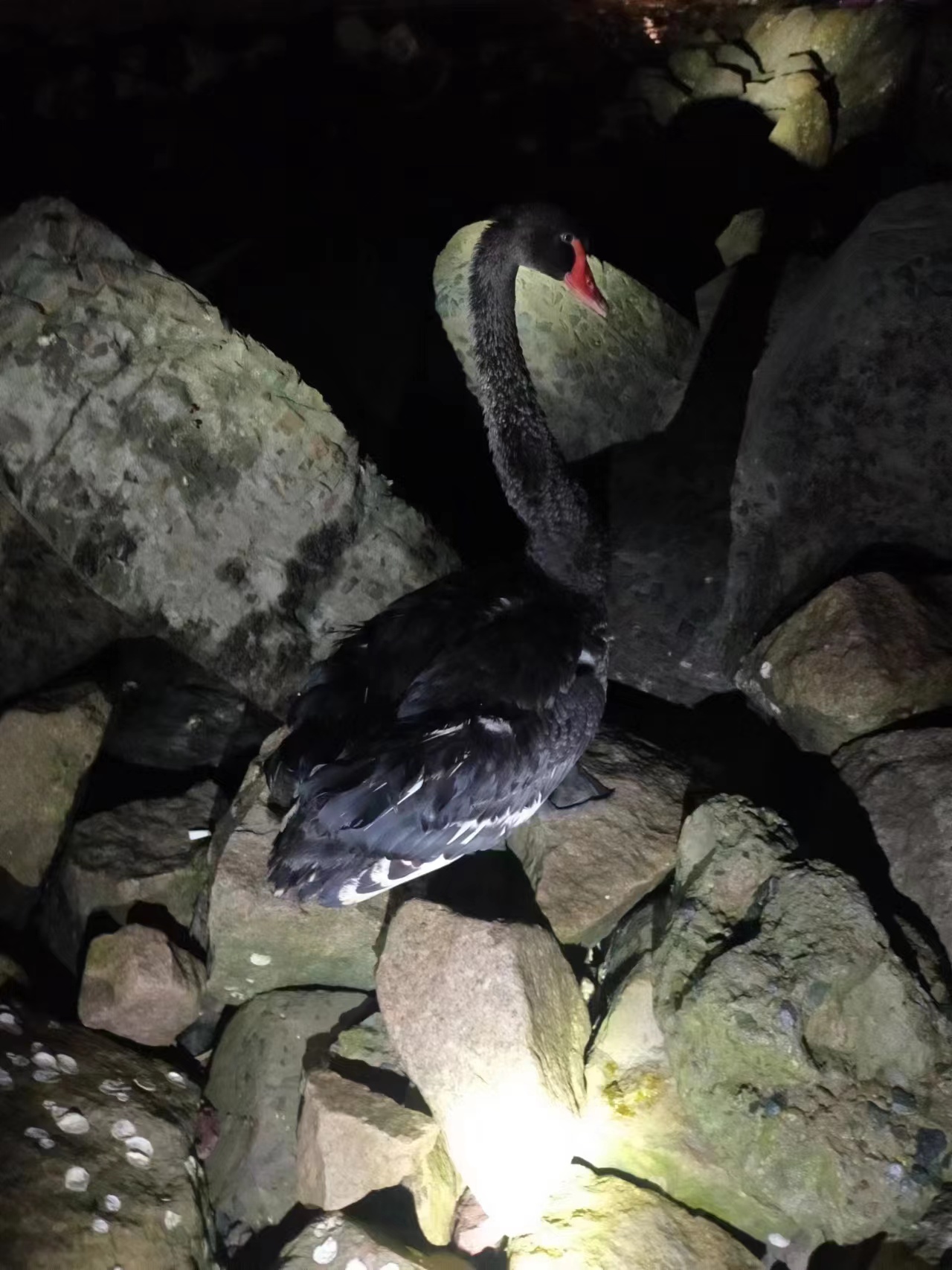 當天23:00,李漢濤和姜永輝在海堤巡查時(shí),發(fā)現一只受傷的黑天鵝。當時(shí),這只大鳥(niǎo)精神不振,渾身顫抖,體力似乎不支,已經(jīng)無(wú)法自行飛起。兩人迅即將情況上報給派出所值班民警,并按指示將黑天鵝帶回派出所做進(jìn)一步處理。