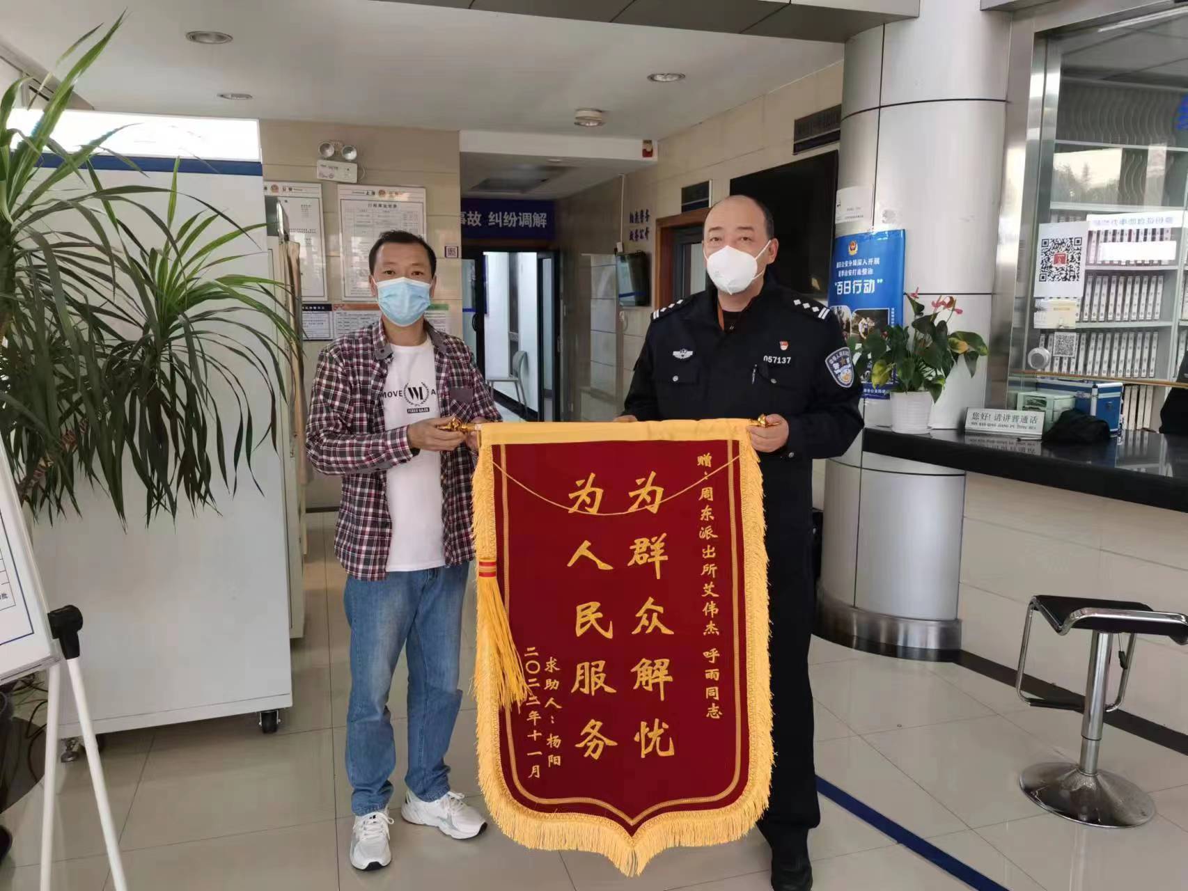 11月12日,浦東公安分局周東派出所收到市民楊先生送來(lái)的一面繡有“為群眾解憂(yōu) 為人民服務(wù)”的錦旗,感謝宗保公司駐派出所項目員工幫尋寵物狗狗主人的熱心行為。