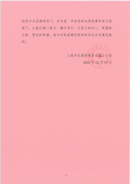 1月30日,上海市空港管理委員會(huì )辦公室送來(lái)感謝信,感謝公司疫情期間對浦東機場(chǎng)疫情防控工作的大力支持。