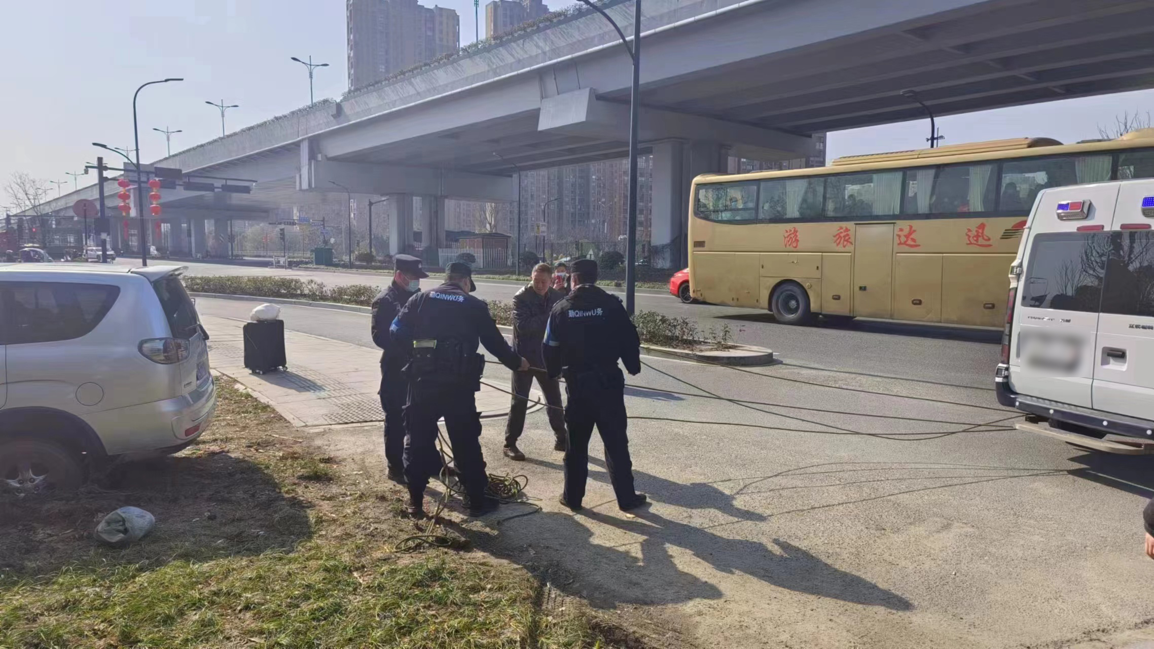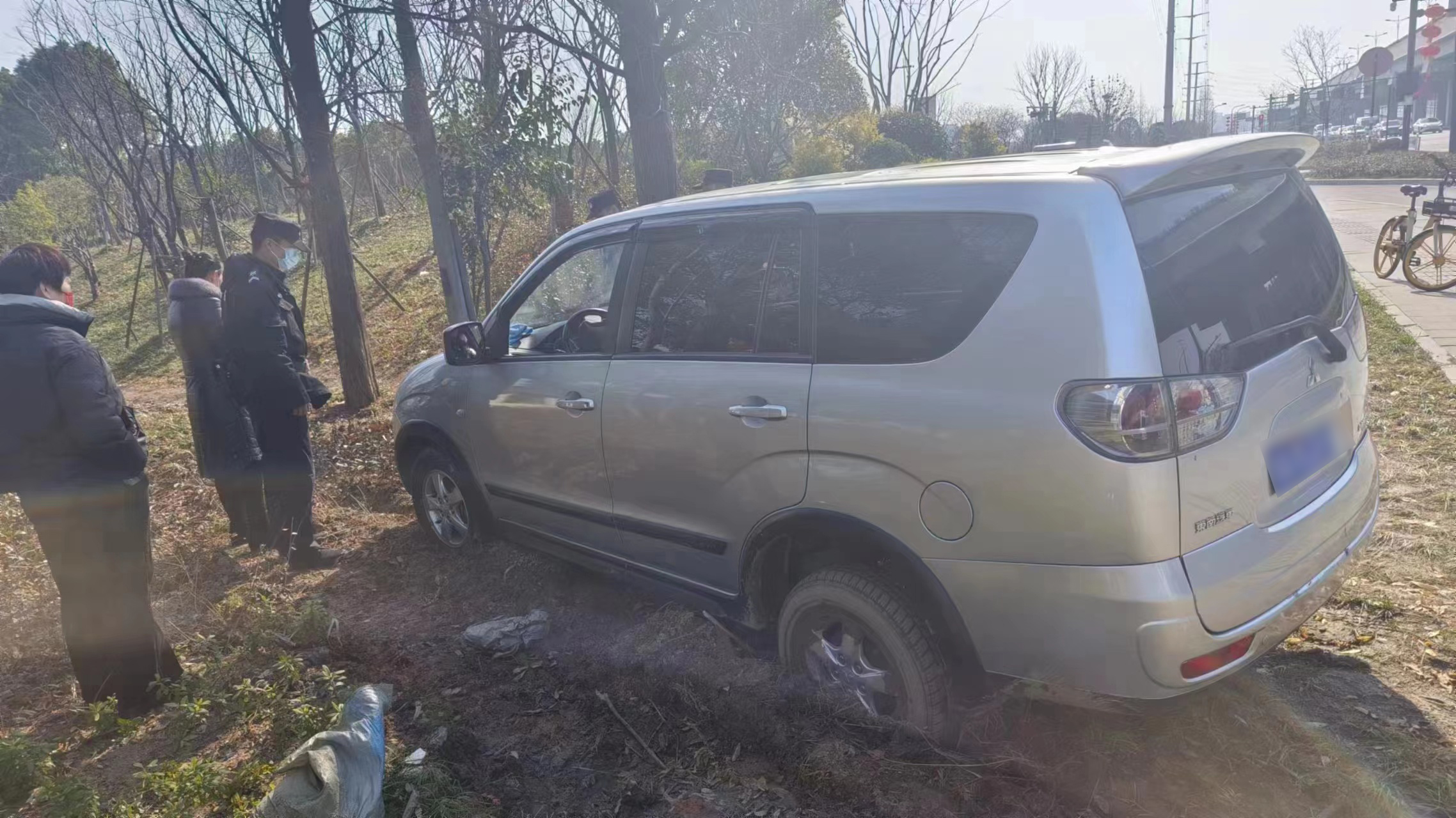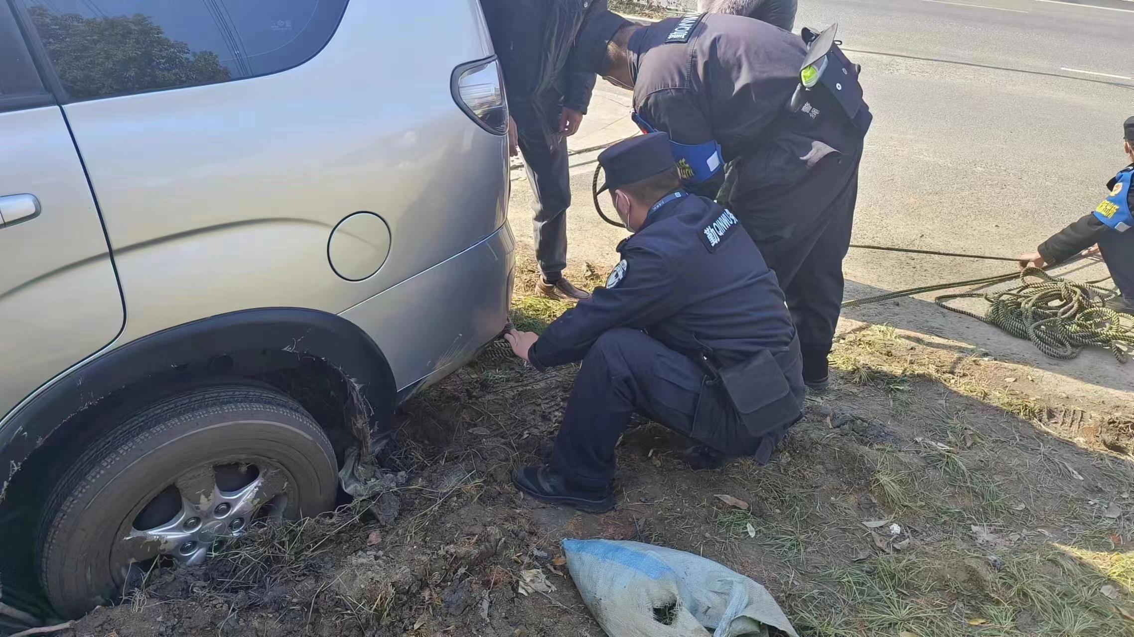 當日11:02,公司員工李瑞龍、劉振疆和新城派出所輔警王丹杰、周天誠巡邏至康橋路與通益路交叉口時(shí),發(fā)現一輛銀色商務(wù)轎車(chē)陷到了泥地之中,車(chē)后雖有人助推,但仍然無(wú)法行走。幾人見(jiàn)狀趕緊上前詢(xún)問(wèn),原來(lái)車(chē)主于師傅送朋友到良渚南莊兜車(chē)站乘車(chē)。因路況不熟,不小心將車(chē)開(kāi)到了泥濘的綠化帶中。