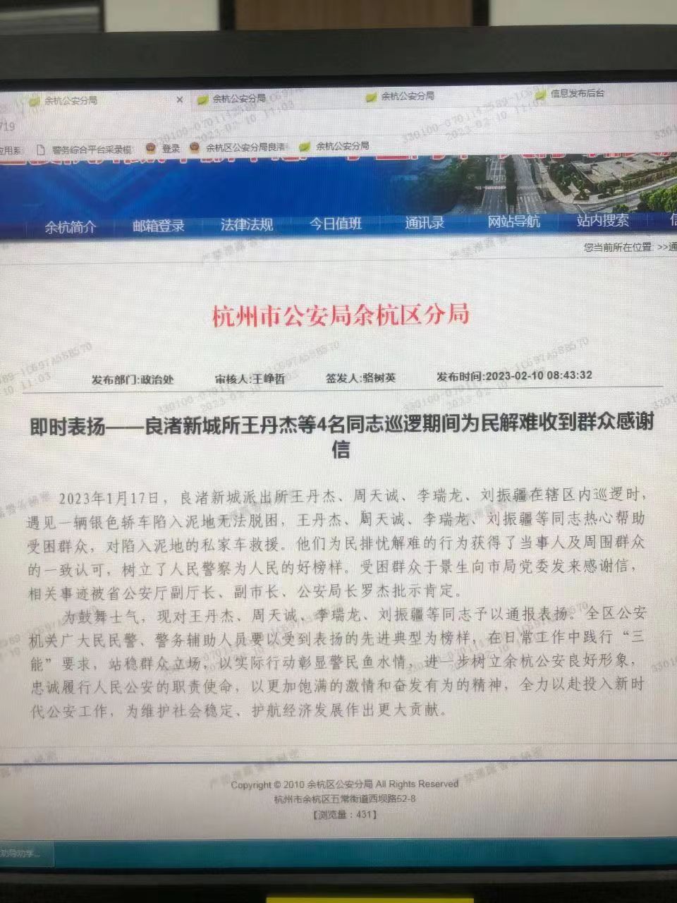 看著(zhù)脫困的車(chē)子,于師傅十分感激,激動(dòng)地說(shuō):“真是太感謝你們了,要不是你們幫忙,我朋友回老家可能要錯過(guò)車(chē)子了?!笔潞?,民泰員工熱心幫助受困群眾的行為受到了杭州市公安局余杭區分局的通報表?yè)P。
