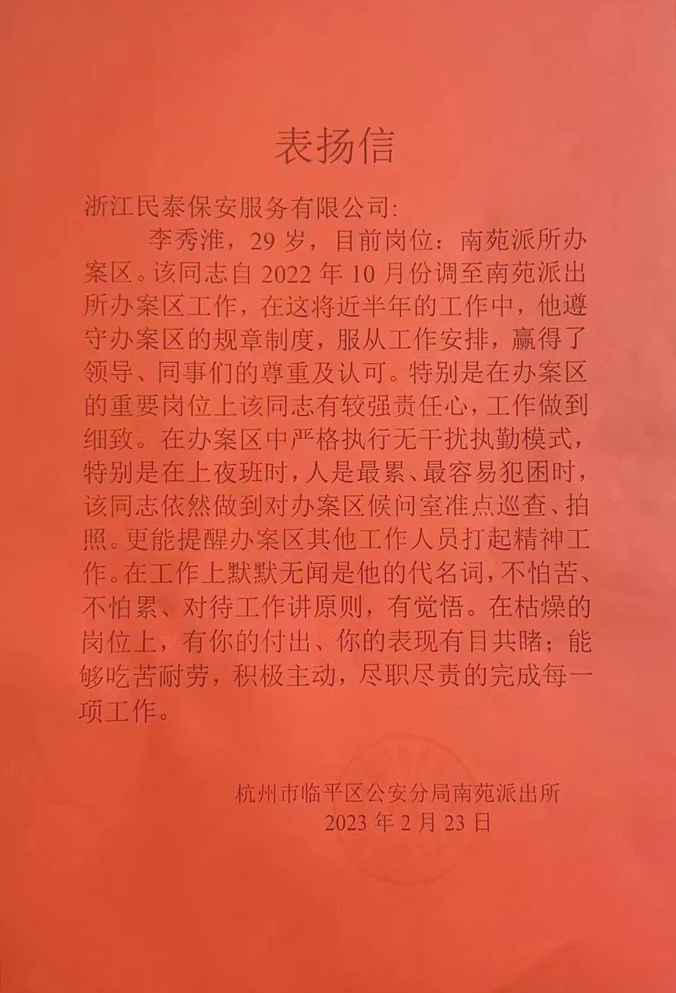 3月3日,浙江民泰公司收到杭州市臨平區公安分局南苑派出所的表?yè)P信,信中對公司員工李秀淮出色的工作表現給予表?yè)P。