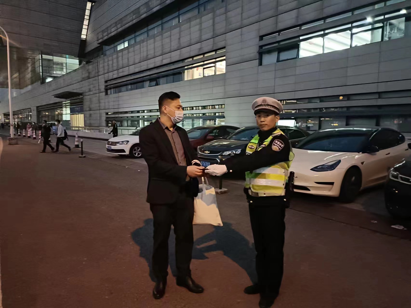 大概過(guò)了一個(gè)多小時(shí),一位學(xué)生模樣的小伙在共享單車(chē)邊上看來(lái)看去,好像在尋找什么東西。李振林見(jiàn)狀主動(dòng)上前,詢(xún)問(wèn)小伙是不是在找一個(gè)文件袋。核實(shí)確認后,李振林就把文件袋交還給了他。