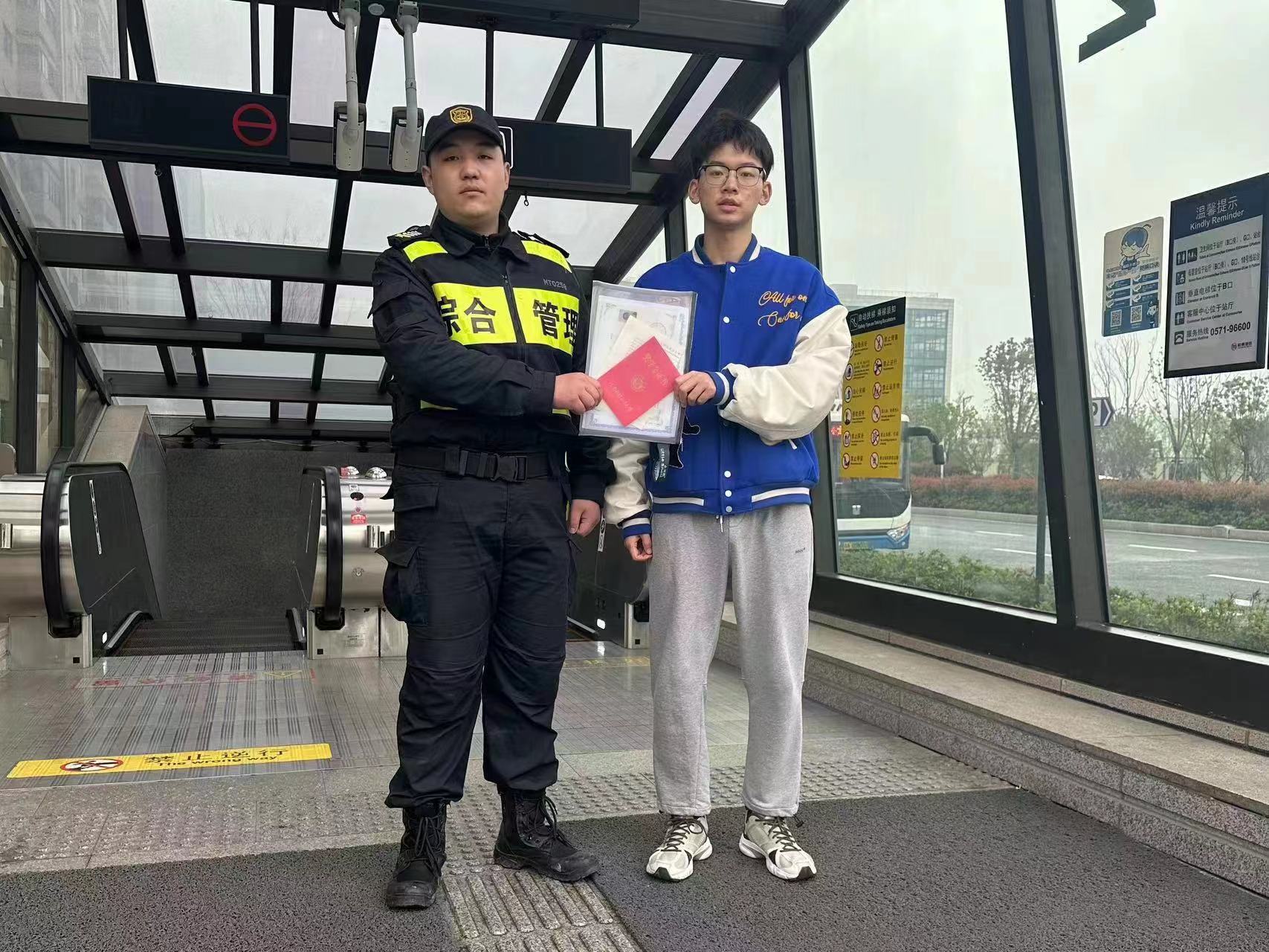 當日13:30,公司員工李振林在杭行路地鐵站值勤時(shí),發(fā)現一輛共享單車(chē)的車(chē)筐里有一個(gè)文件袋,內有畢業(yè)證書(shū)、獎學(xué)金證書(shū)、職業(yè)等級證書(shū)和個(gè)人簡(jiǎn)歷等資料,周?chē)鸁o(wú)人也沒(méi)人認領(lǐng)??紤]到失主可能會(huì )返回尋找,李振林便在地鐵站邊值勤邊等待失主。