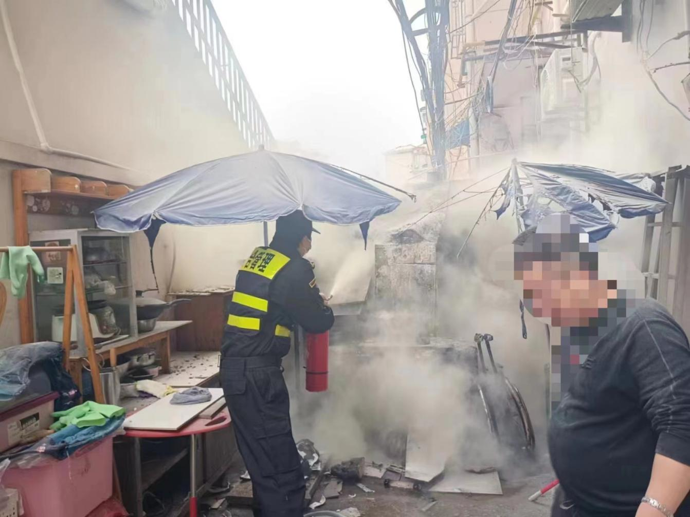 原來(lái)是小區樓道里堆放的雜物著(zhù)火了,熊統超急忙將火情報告當班組長(cháng)和物業(yè)崗亭值班人員,并趕緊奔向物業(yè)門(mén)崗拿起兩個(gè)滅火器進(jìn)行撲救,有效地控制住了火勢蔓延,消除了安全隱患。