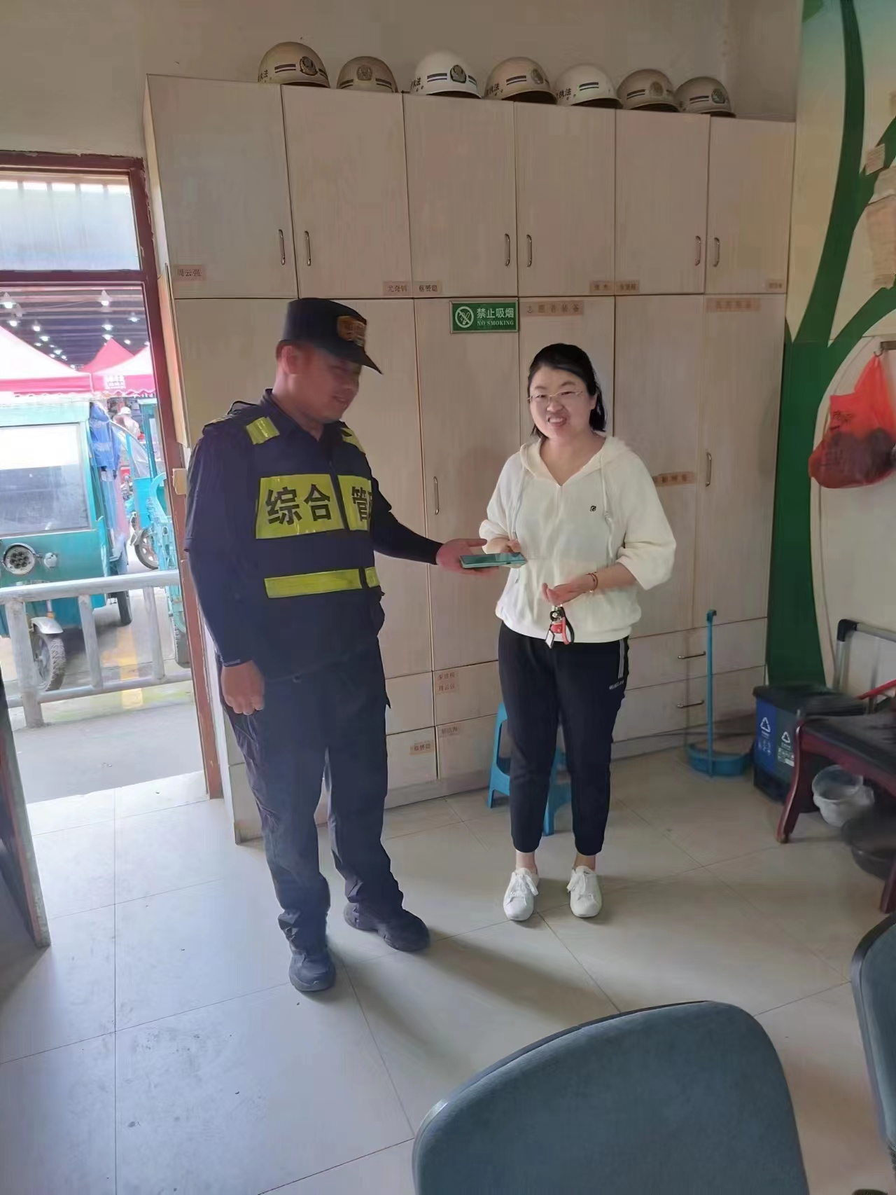 11:20左右,一位身穿白色衣服的女子前來(lái)詢(xún)問(wèn)是否撿到一部華為手機。周雷向該女子了解了手機的顏色、型號,確認其是失主后,帶女子到市場(chǎng)辦公室取手機交還給了女子。女子拿到失而復得的手機十分高興,連連向民泰公司員工周雷道謝。