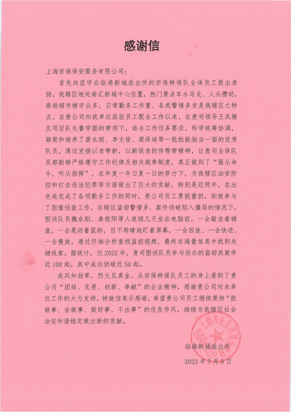 公司駐臨港新城派出所項目收到錦旗和感謝信,不單單是對宗保公司員工工作的肯定和認可,更是對公司員工工作的激勵和鞭策。大家表示將保持和發(fā)揚工作嚴謹、認真細致、擔當作為的工作作風(fēng),積極順應臨港新城平安建設新形勢,主動(dòng)適應派出所工作新要求,不斷地自我加壓,不斷地提高業(yè)務(wù)水平,為助力促進(jìn)臨港新城治理能力和治理體系現代化建設貢獻自己力量。