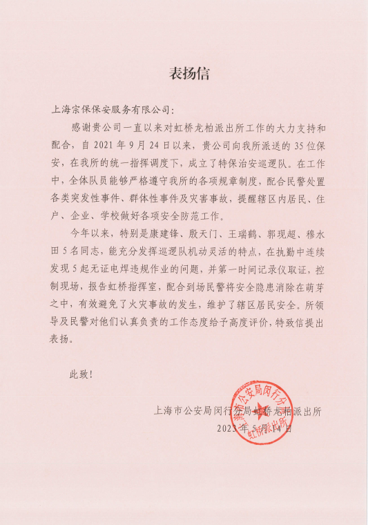 5月14日,宗保公司駐閔行區虹橋龍柏派出所輔助項目收到閔行公安分局虹橋龍柏派出所的表?yè)P信,感謝公司對派出所工作的大力支持和配合,表?yè)P公司員工在開(kāi)展警務(wù)輔助中的良好表現。