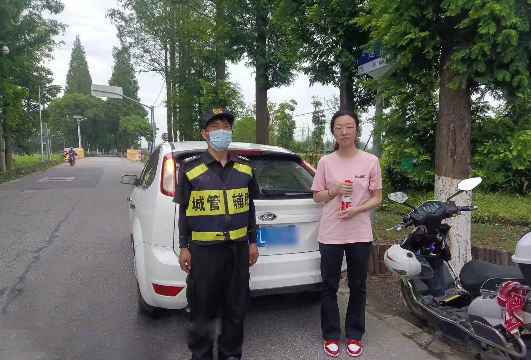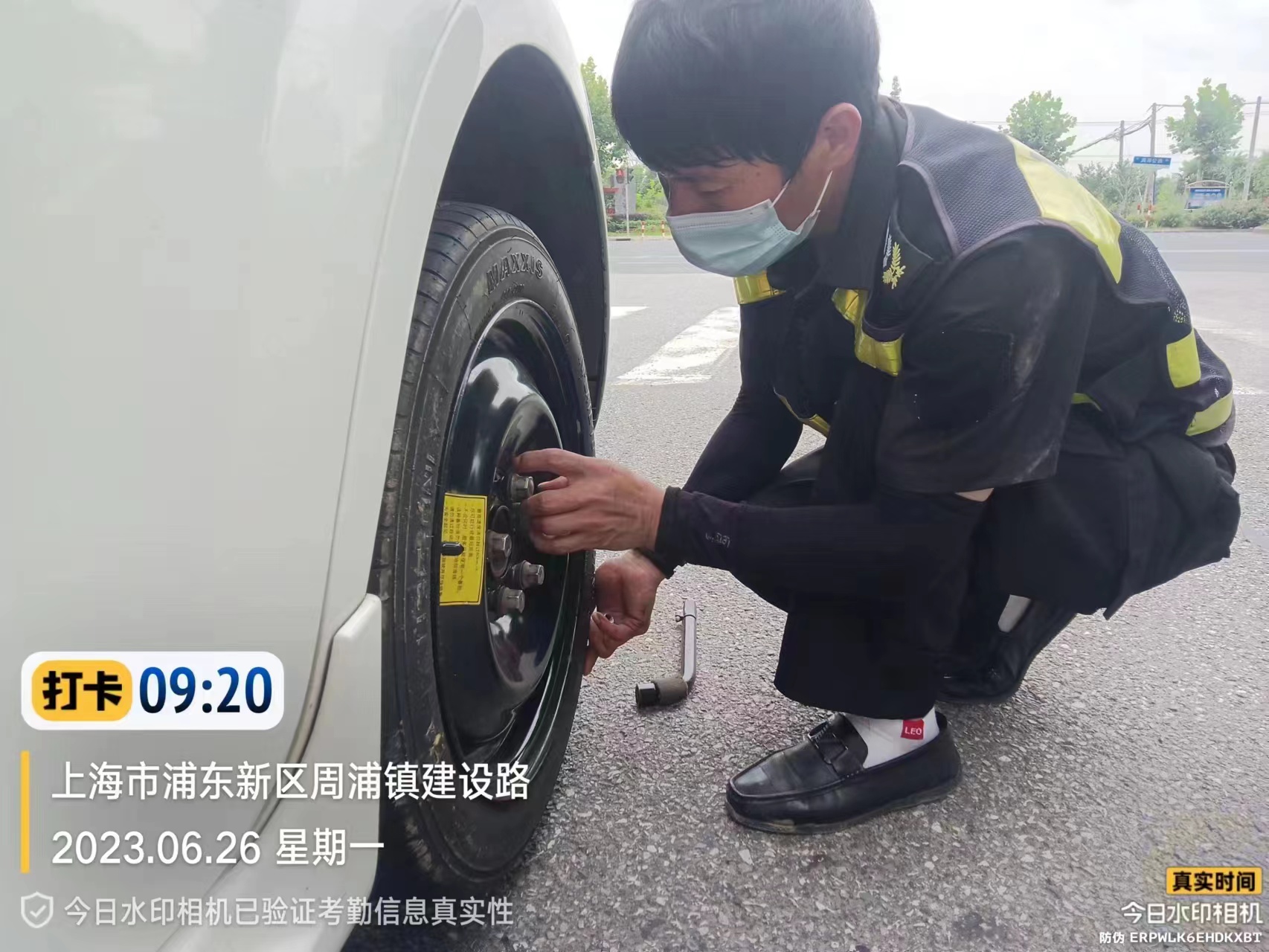 6月26日,宗保公司駐浦東新區周浦市容項目員工幫助女士更換轎車(chē)輪胎。