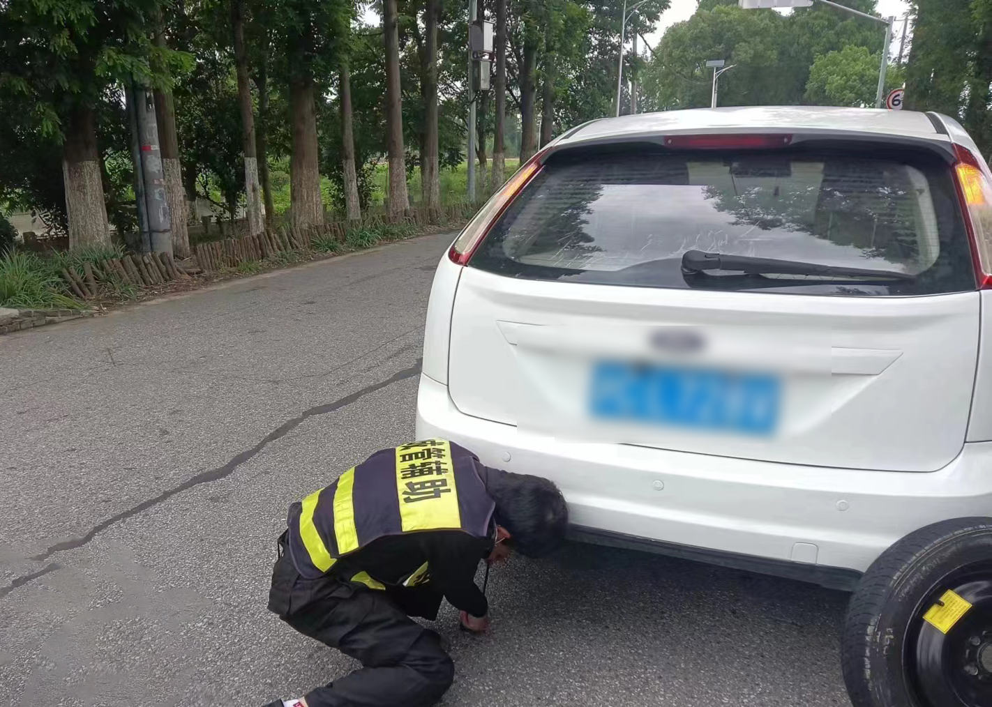 女士車(chē)胎無(wú)氣急求助 員工幫忙換胎解其困