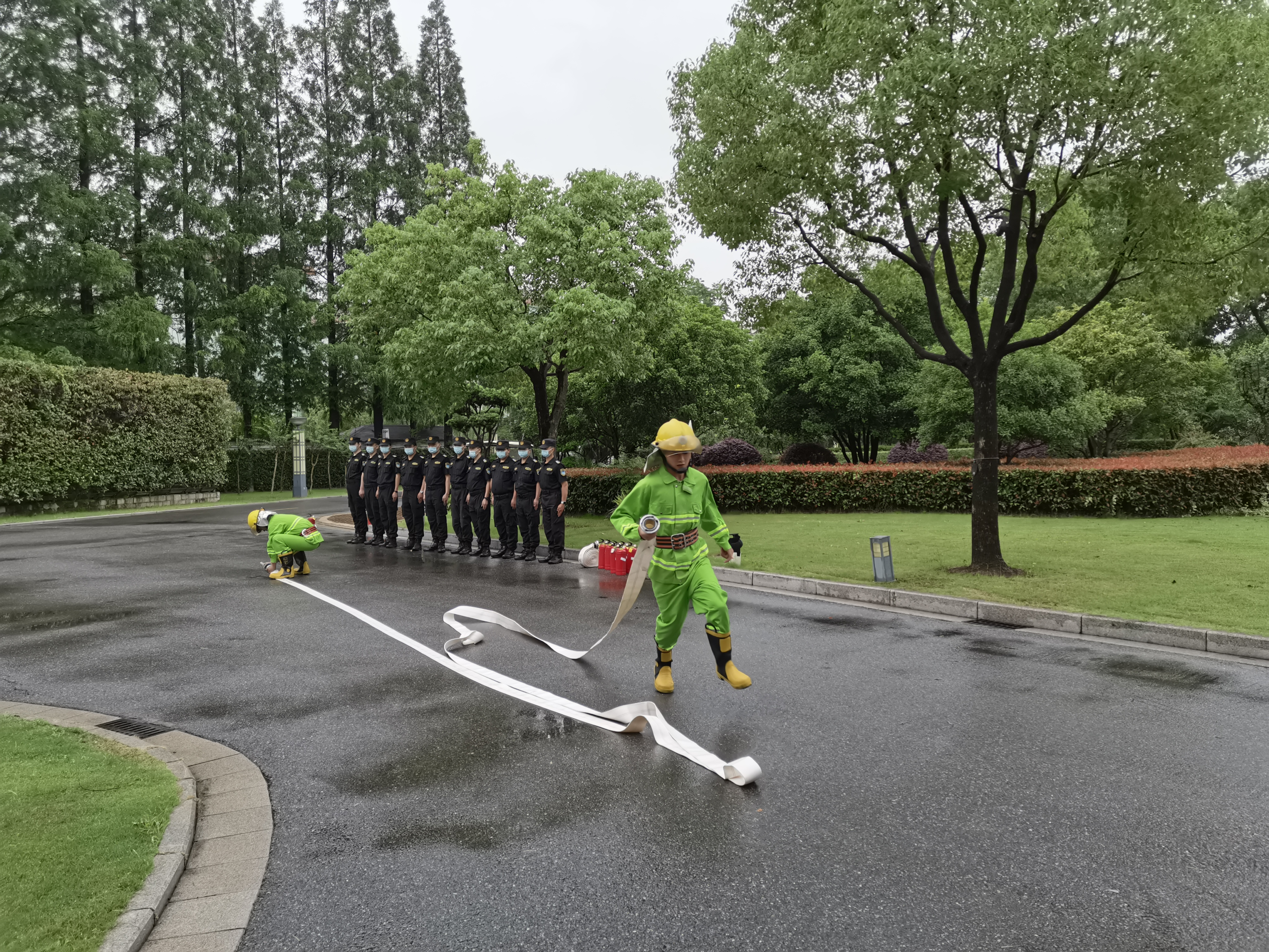 演練中,負責人結合近年來(lái)典型的火災案例,分析了發(fā)生火災的原因,強調了發(fā)生火災應注意的事項,并就火災報警、撲救、逃生、疏散等消防知識進(jìn)行了詳細講解。隨后,開(kāi)展火災情景模擬演練,按照“一提、二搖、三拔、四瞄、五壓噴”的流程,演示了消防器材的使用方法、消防水帶如何使用以及如何進(jìn)行初期火災撲救。