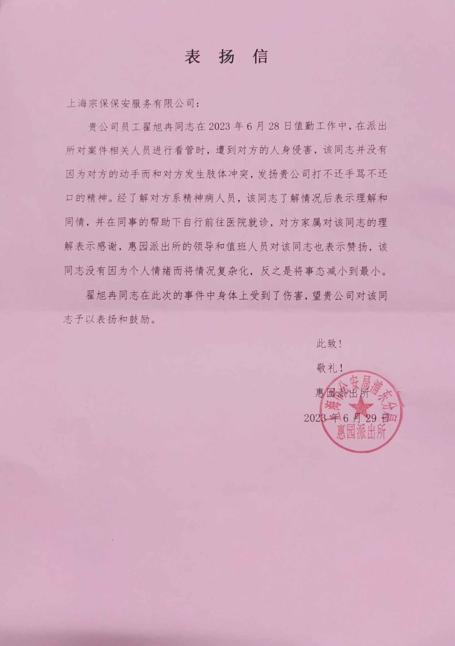 6月29日,宗保公司駐惠園派出所輔助項目收到惠園派出所的表?yè)P信,信中表?yè)P了公司員工翟旭冉忍辱克制的優(yōu)秀表現。