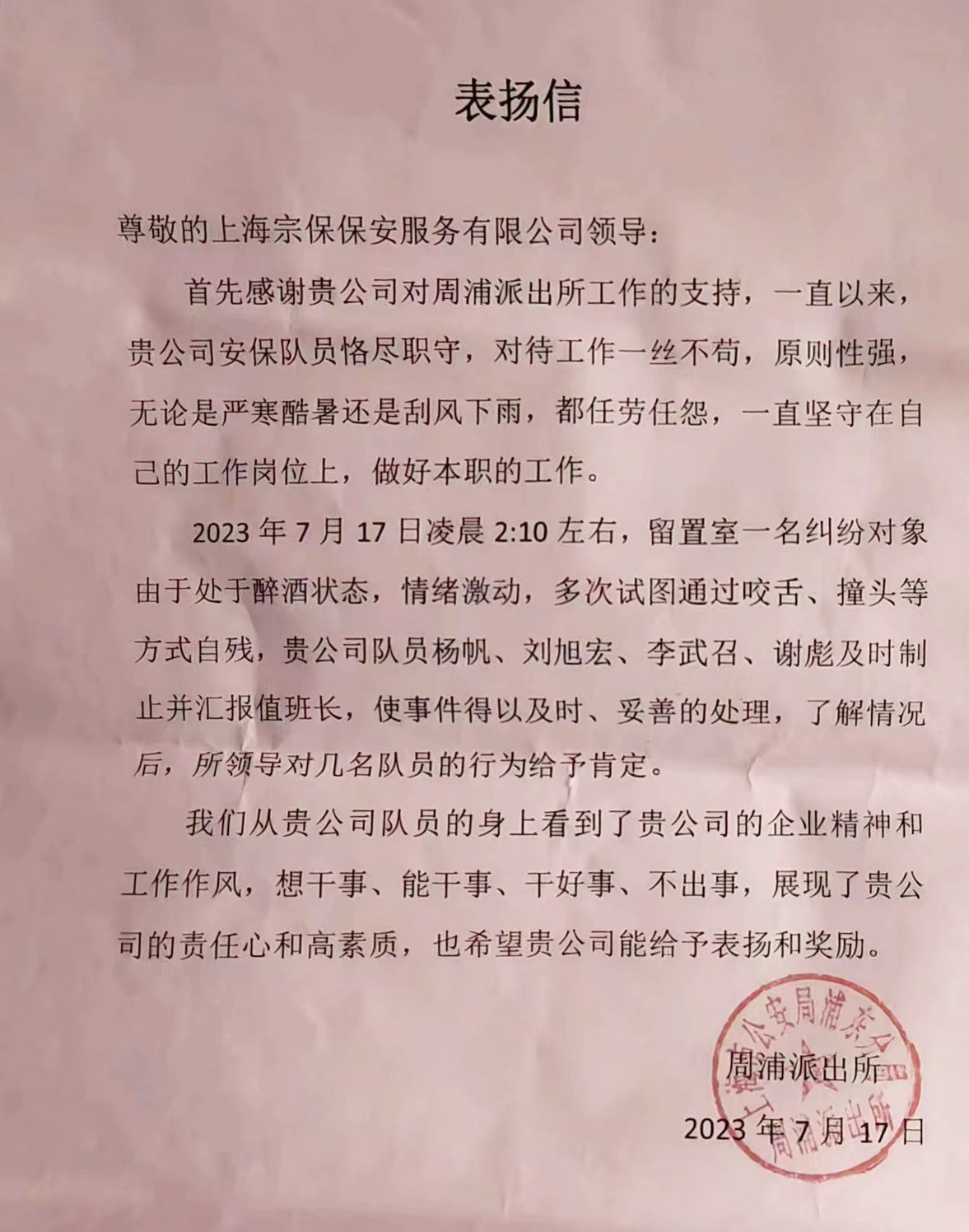 7月17日,宗保公司收到浦東公安分局周浦派出所的表?yè)P信,表?yè)P公司員工恪盡職守、認真細致的工作表現。