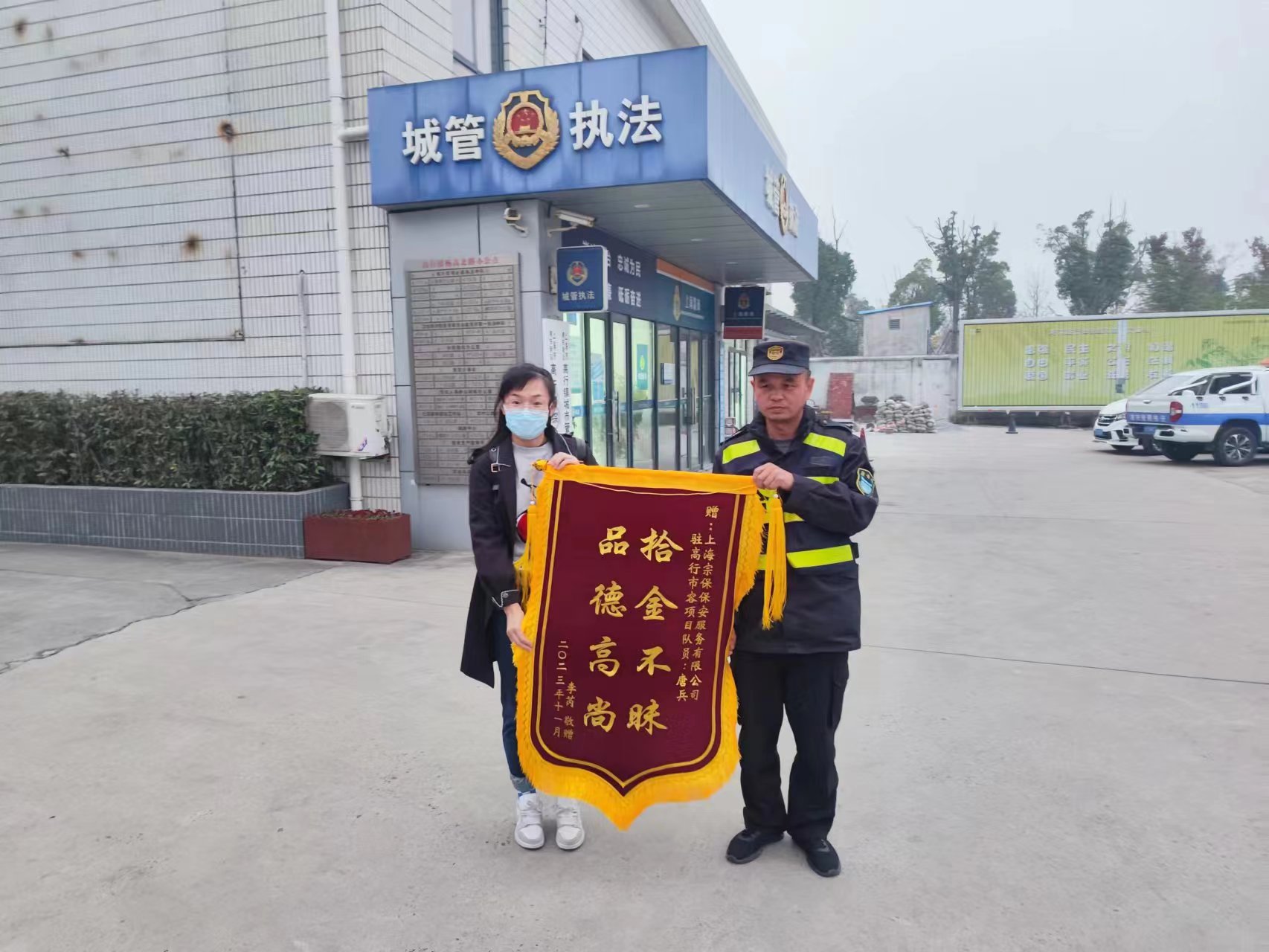 11月24日,市民李女士將一面繡有“拾金不昧 品德高尚”的錦旗贈送給宗保公司駐浦東新區高行市容項目員工唐兵,感謝他拾金不昧的行為。