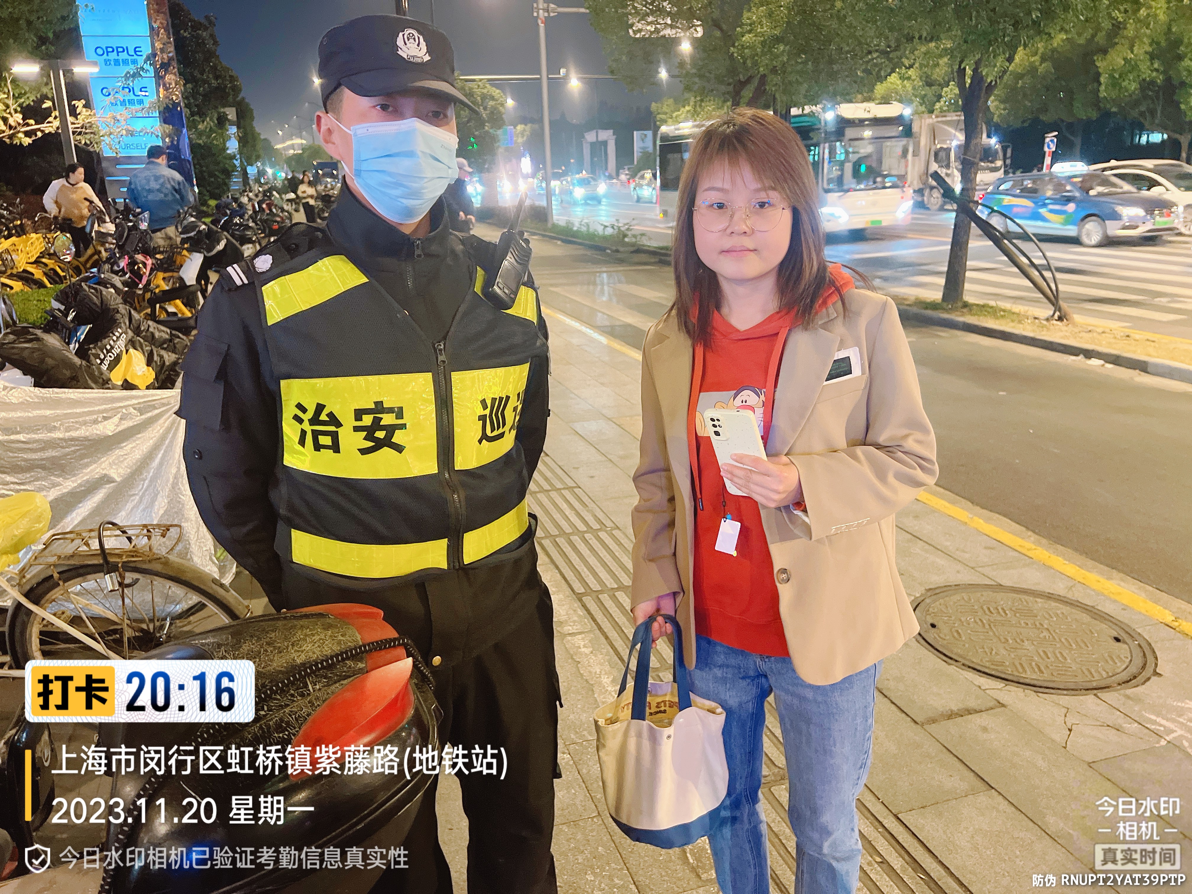 11月20日19:35,宗保公司駐閔行區虹橋交管輔助項目員工黃志亮在吳中路與虹莘路路口值勤時(shí),撿到一部華為手機,報告帶班組長(cháng)后便在原地等待。大約過(guò)了20分鐘,仍沒(méi)有失主來(lái)尋找,黃志亮就將手機交給了前來(lái)接班的同事薛峰崗保管。20:16,一位身穿駝色外套的女子趕到現場(chǎng)尋找手機。薛峰崗詢(xún)問(wèn)女子手機的品牌、顏色、型號,確認與撿到的手機相符后,便把手機交還給了她。得知事情原委的女子,再三請薛峰崗代其向黃志亮表示感謝。