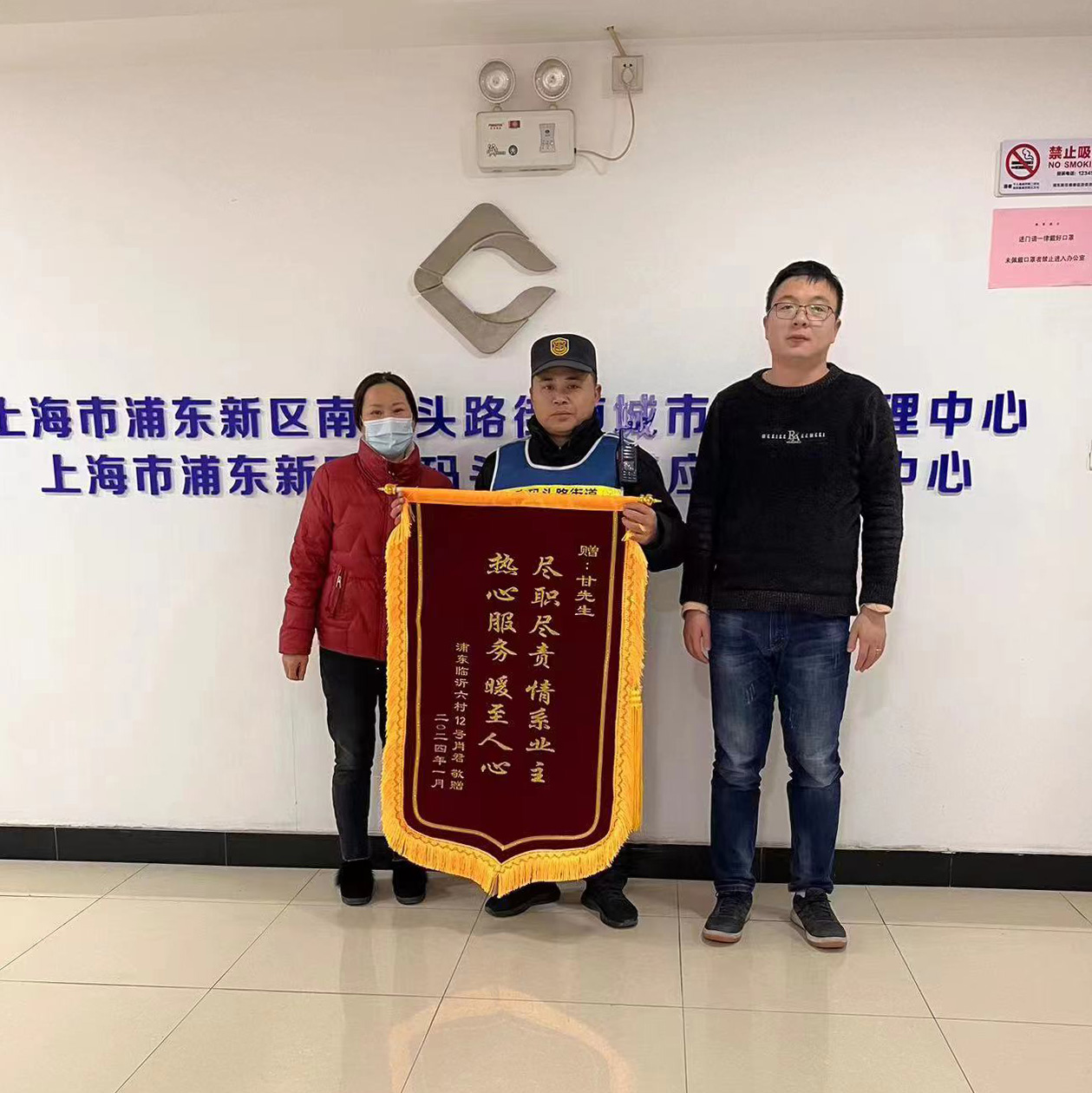 1月21日,宗保公司駐浦東新區南碼頭網(wǎng)格項目員工甘文兵收到市民肖女士送來(lái)的一面繡有“盡職盡責情系業(yè)主 熱心服務(wù)暖至人心”的錦旗,贊揚他拾金不昧的助人行為。