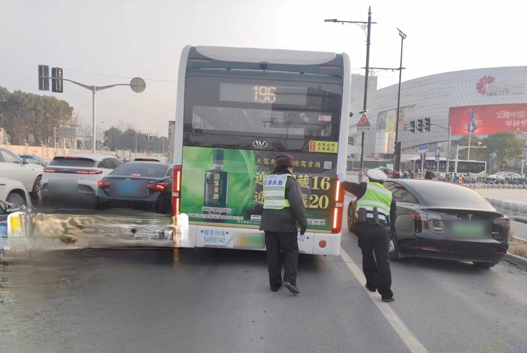 當日16:00,公司員工盧爾子和楊照龍在七莘路與顧戴路路口值勤時(shí),看到路口北側道路中間停著(zhù)一輛公交車(chē),駕駛員站在車(chē)旁顯得很焦急。