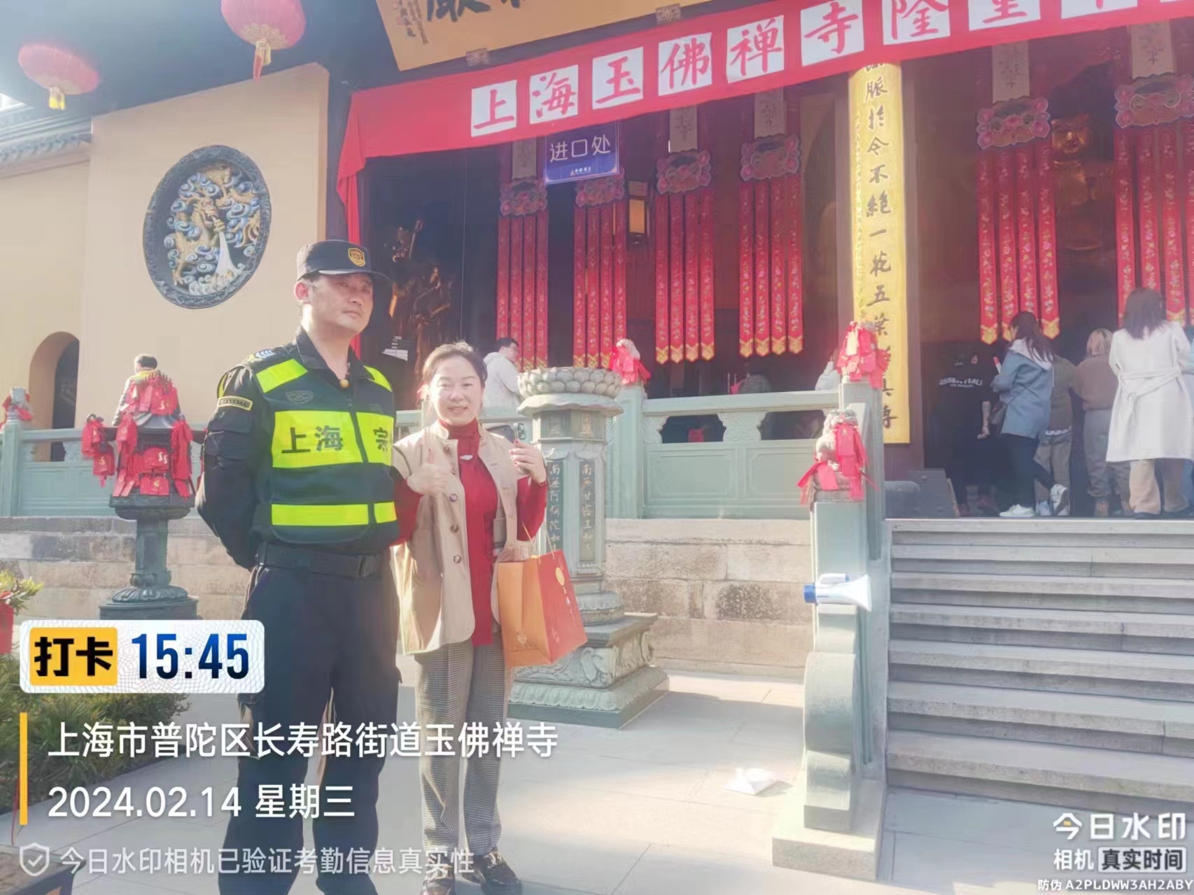 2月14日15:30,宗保公司員工王明明在協(xié)助維護玉佛寺秩序時(shí),撿到一部蘋(píng)果15手機。因手機設有鎖屏密碼無(wú)法聯(lián)系失主,王明明便將情況報告了帶隊骨干,并按指示在原地邊值勤邊等待失主。大概過(guò)了15分鐘,一位自稱(chēng)是失主的女士打來(lái)電話(huà),王明明通過(guò)詢(xún)問(wèn)手機的顏色、品牌等信息后,便與她約好在大雄寶殿碰面。不一會(huì )兒,一位女士急匆匆地趕到約定地點(diǎn)。王明明看她成功解開(kāi)手機鎖屏密碼,確認其是失主后,就將手機交還給了她。女士拿著(zhù)手機,再三向宗保員工王明明道謝。