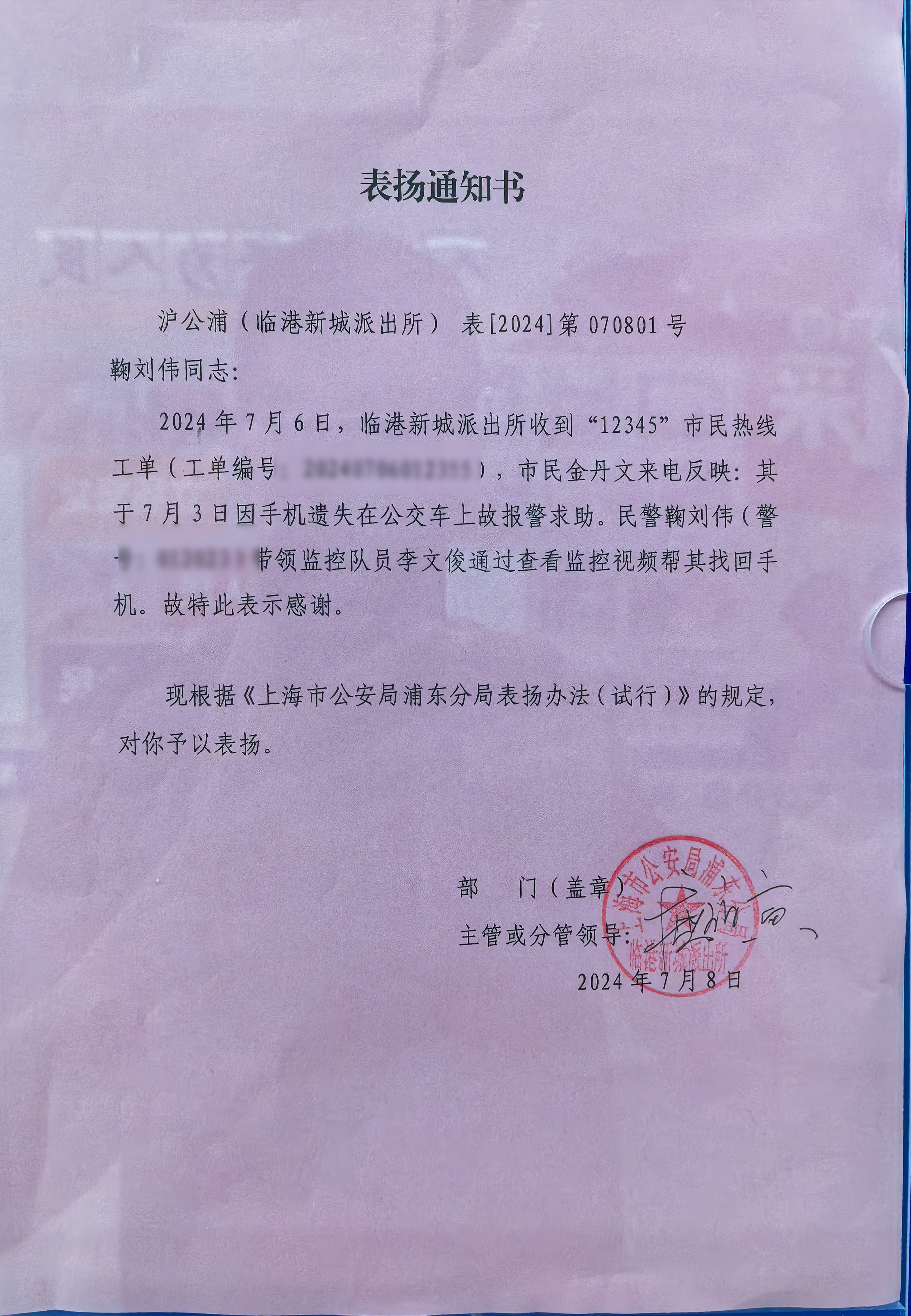 7月3日,宗保公司駐浦東新區臨港新城派出所輔助項目員工幫助市民金女士找到遺失手機。