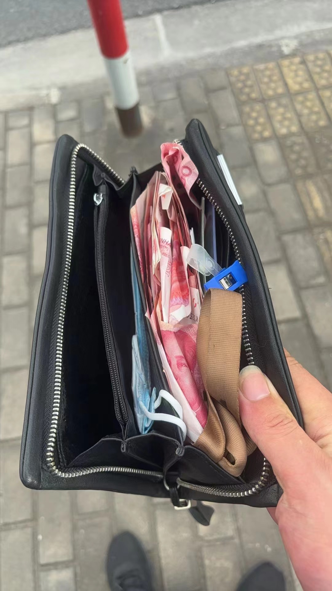劉沐晨第一時(shí)間將情況報告了項目負責人,并按指示先在路口處等待看是否有人前來(lái)尋找,同時(shí)開(kāi)啟執法記錄儀對包內物品進(jìn)行清點(diǎn),包內裝有現金7800元、一張收款碼和一些貨款收據,但沒(méi)有發(fā)現失主的有效證件和聯(lián)系方式。