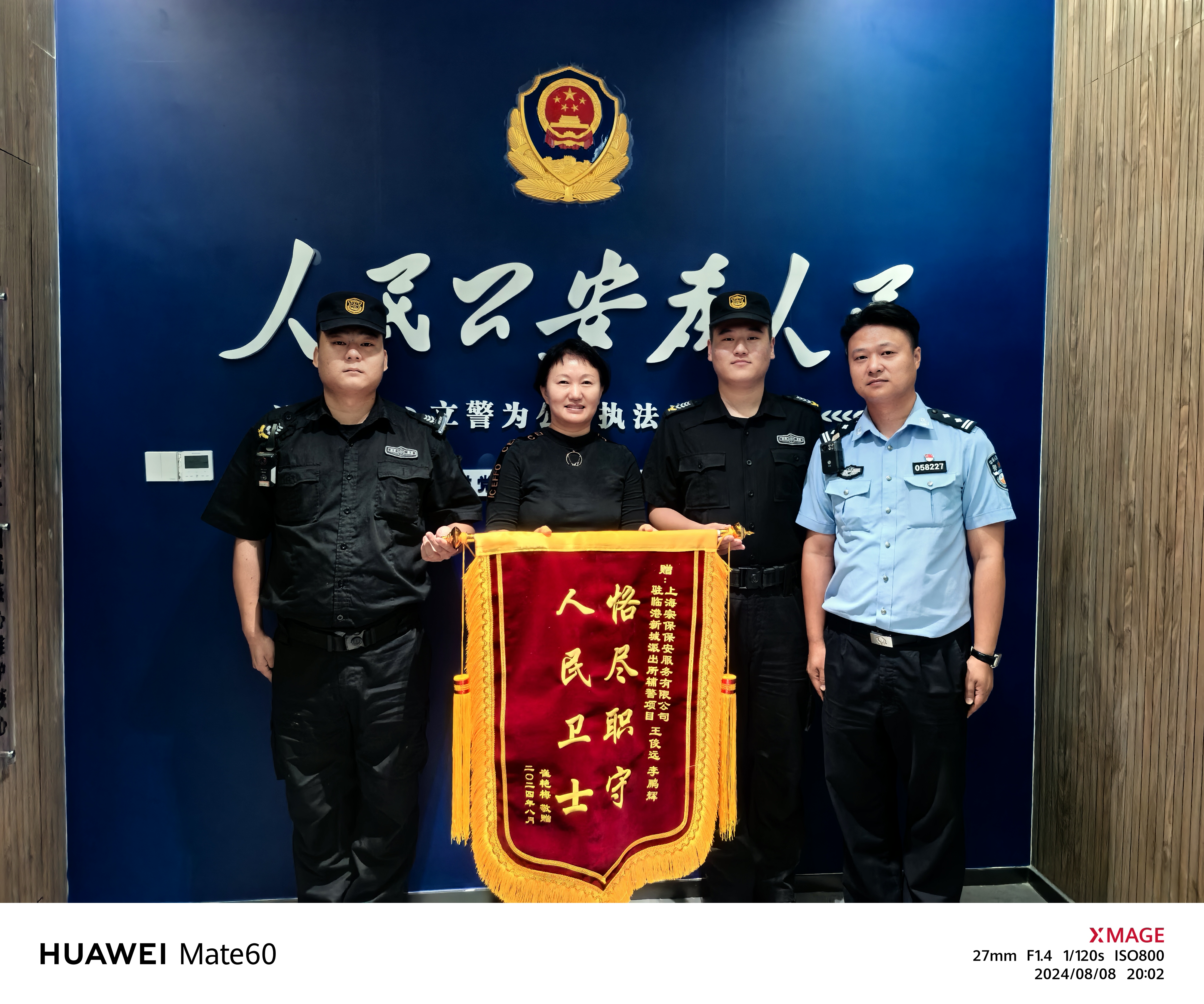 8月8日,宗保公司駐浦東新區臨港新城派出所輔助項目員工收到市民崔女士贈送的一面繡有“恪盡職守 人民衛士”的錦旗,感謝公司員工王俊遠和李鵬輝幫助其女兒張女士的擔當助人行為。