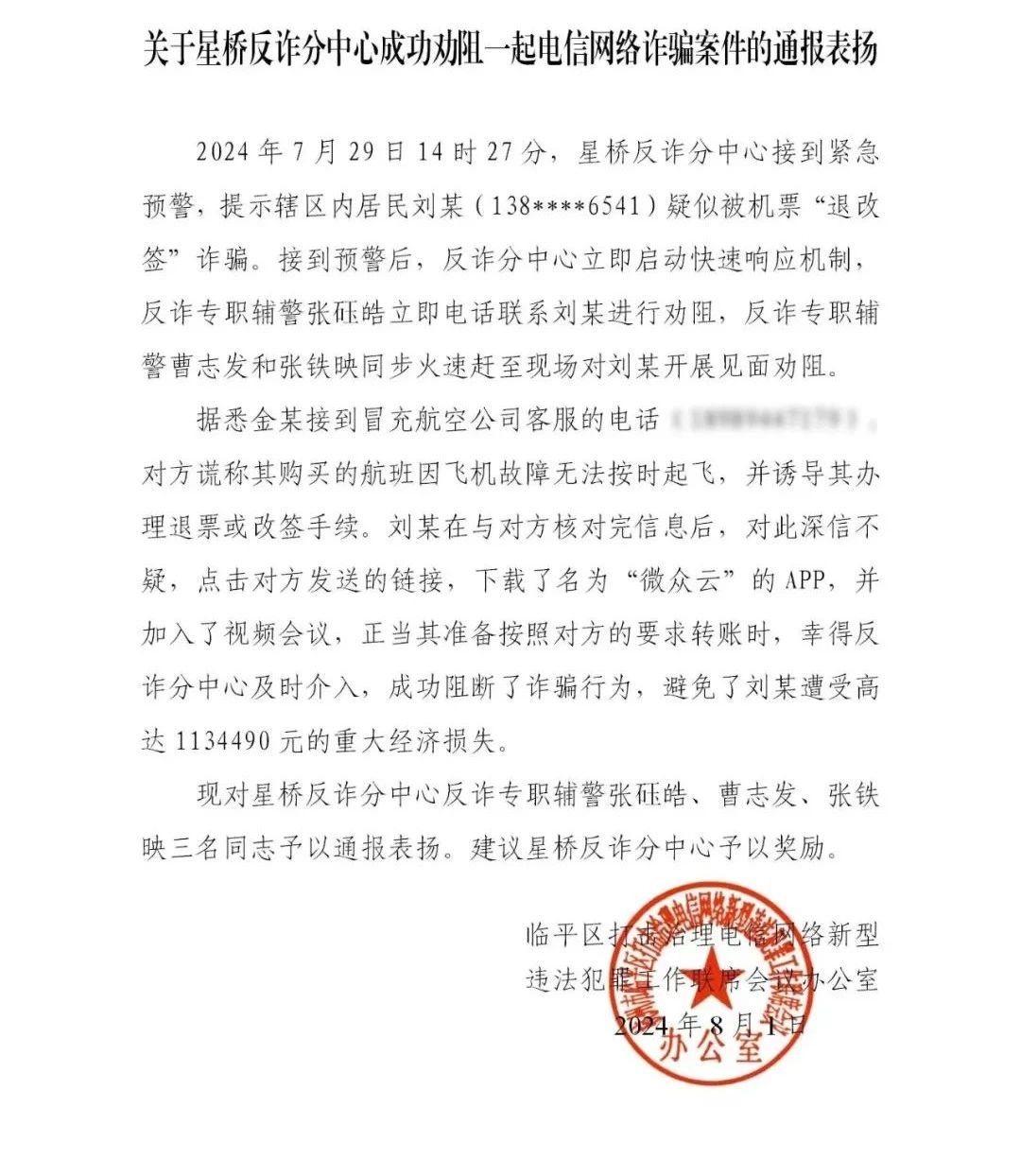 7月29日14:27,杭州市臨平區星橋反詐分中心接到緊急預警,提示轄區內居民劉某疑似被機票“退改簽”詐騙。接到預警后,反詐分中心立即啟動(dòng)快速響應機制,指示民泰員工張砡皓立即電話(huà)聯(lián)系勸阻劉某,同時(shí)安排員工曹志發(fā)和張鐵映火速趕往現場(chǎng)當面勸阻。