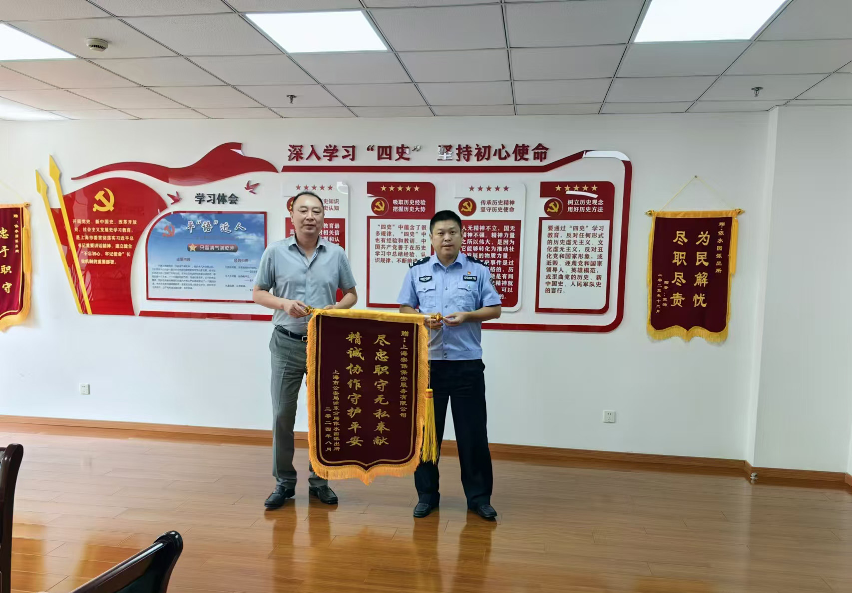 8月29日,上海浦東新區公安分局依水園派出所教導員薛春華將一面繡有“盡忠職守無(wú)私奉獻 精誠協(xié)作守護平安”的錦旗贈送給宗保公司董事長(cháng)王耀,感謝公司對依水園派出所工作的大力支持。
