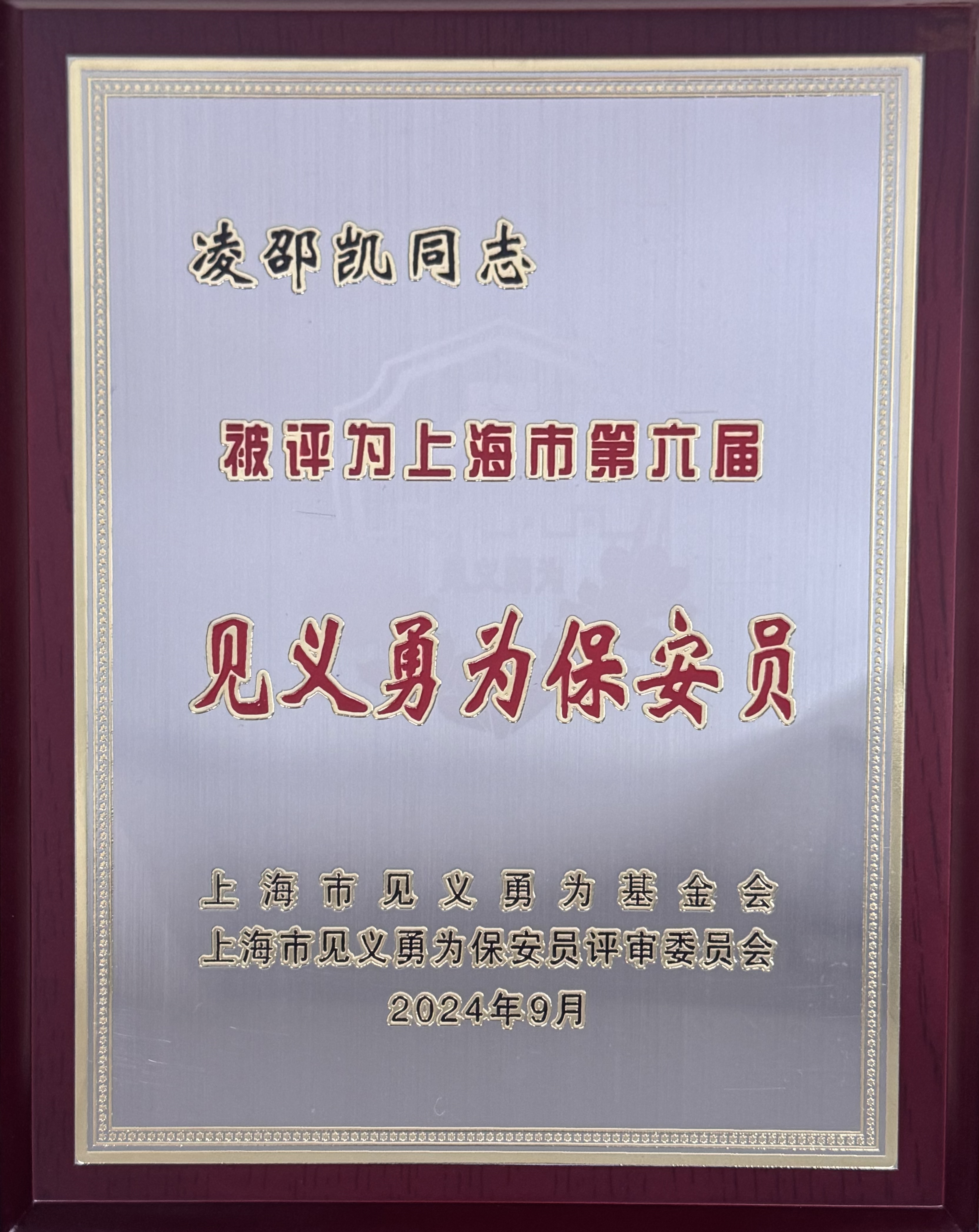 2024年9月27日,上海市見(jiàn)義勇為基金會(huì )在上海市司法局三樓會(huì )議室召開(kāi)2024年二三季度見(jiàn)義勇為先進(jìn)評選表彰發(fā)布會(huì )。會(huì )上,上海宗保保安服務(wù)有限公司員工管旭峰、凌邵凱、吳寶和鄧江峰被評為上海市第六屆“見(jiàn)義勇為保安員”。