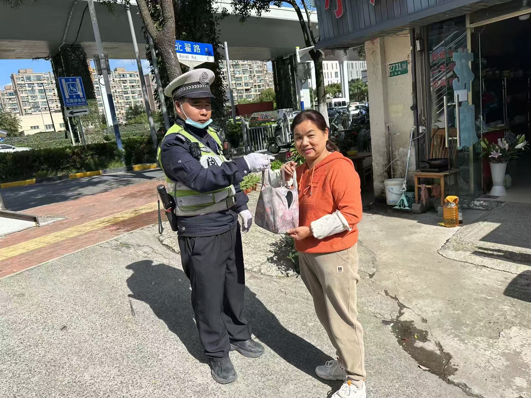 大概過(guò)了10分鐘左右,一位身穿橙色上衣的女士趕到路口尋找手提包。王旭陽(yáng)問(wèn)清手提包顏色、包內物品,確認其是失主后,就把手提包交還給了她。女士拿著(zhù)手提包,連連向王旭陽(yáng)道謝。