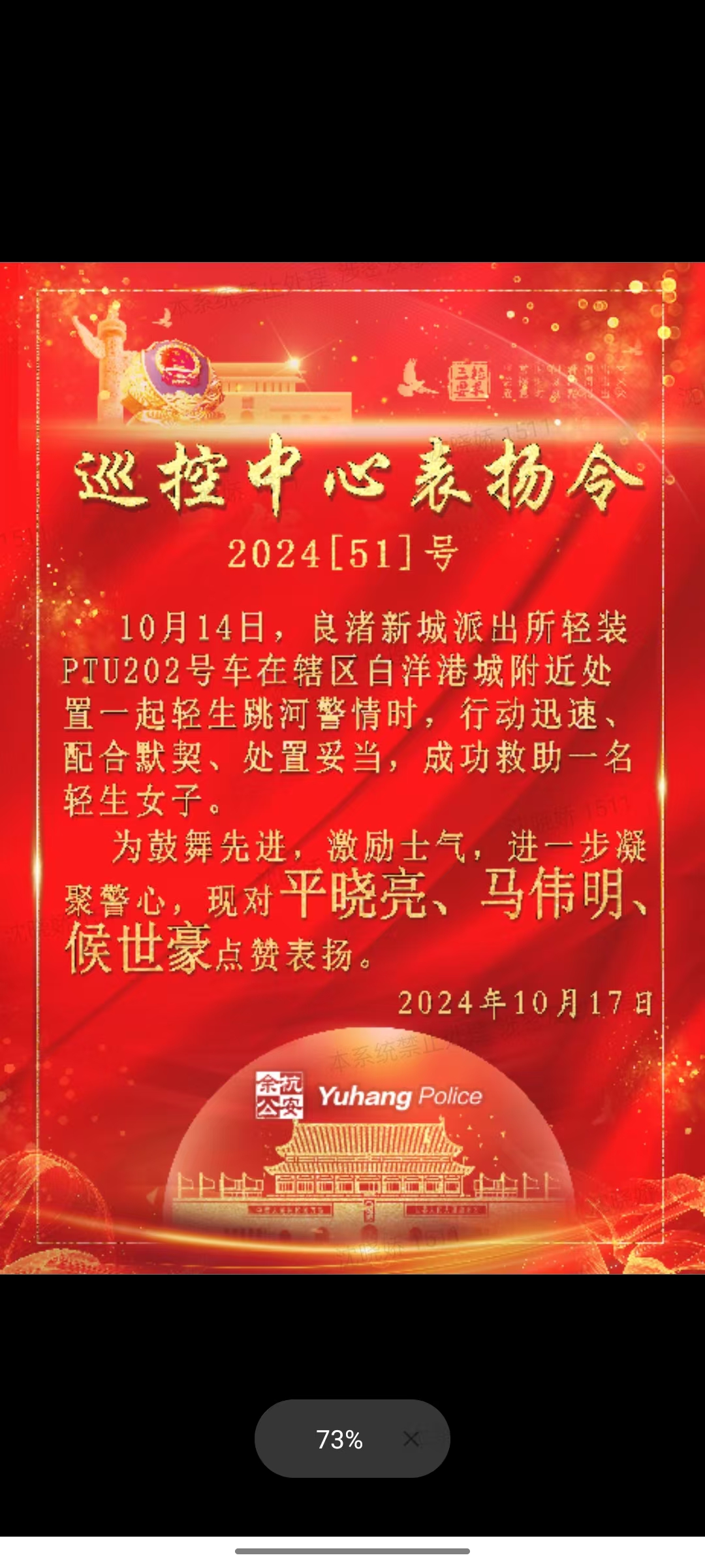 10月14日,浙江民泰駐杭州市余杭區良渚新城派出所輔助項目員工助力成功救下一名欲跳河輕生女子。