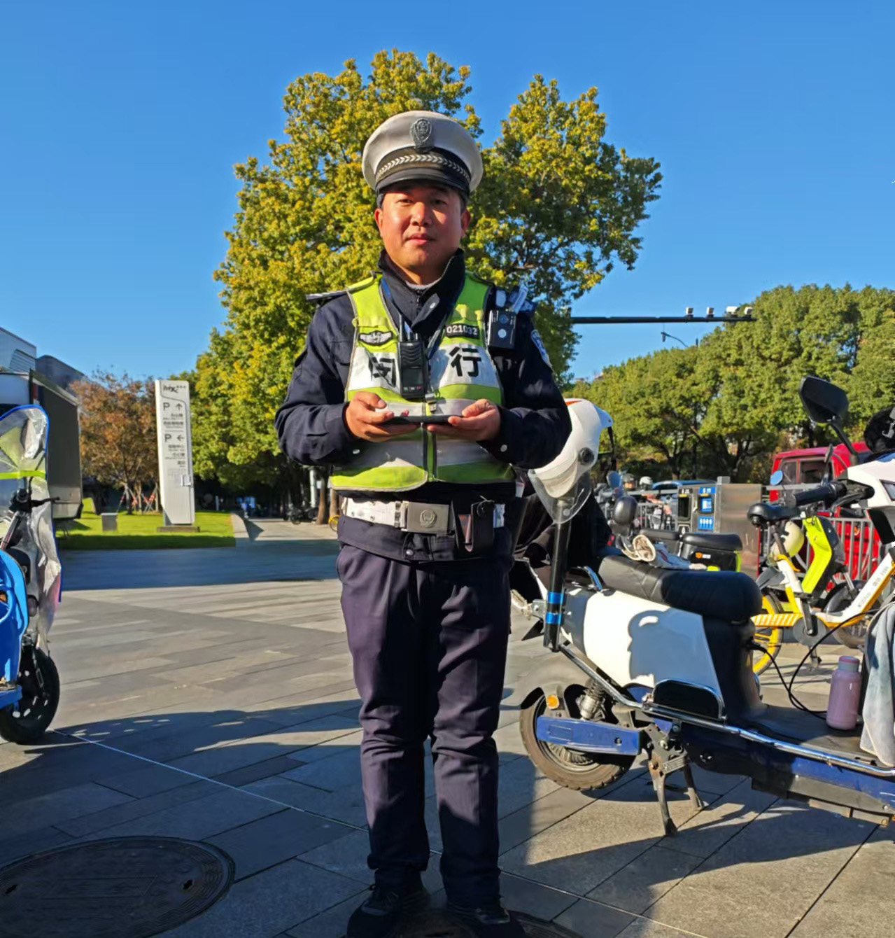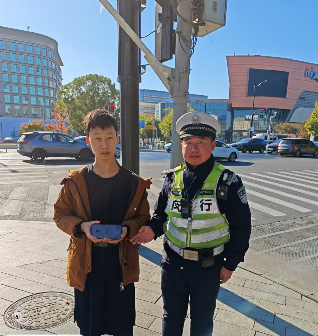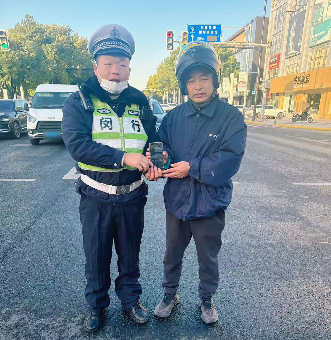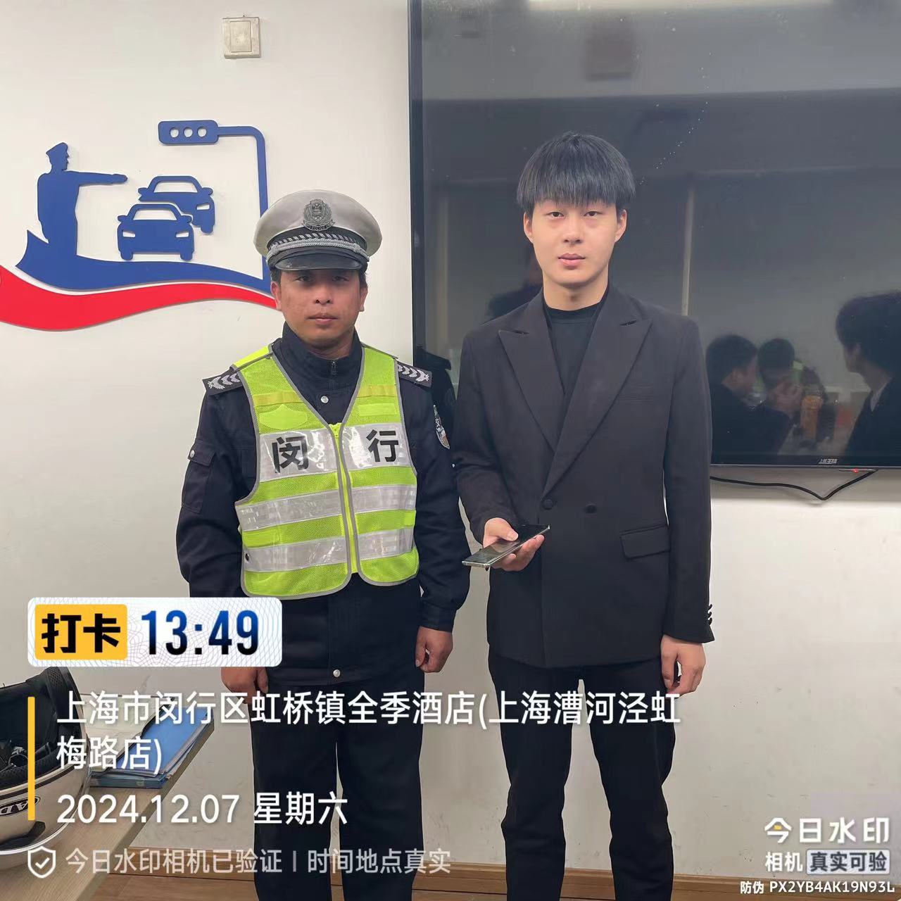 12月7日13:49,一位身穿黑色西裝的男士趕到吳中路虹許路交警崗亭認領(lǐng)手機。丁雄師核實(shí)確認男士是失主后,隨即將手機交還給了他。男士拿到手機,連連稱(chēng)贊丁雄師拾金不昧的助人行為。