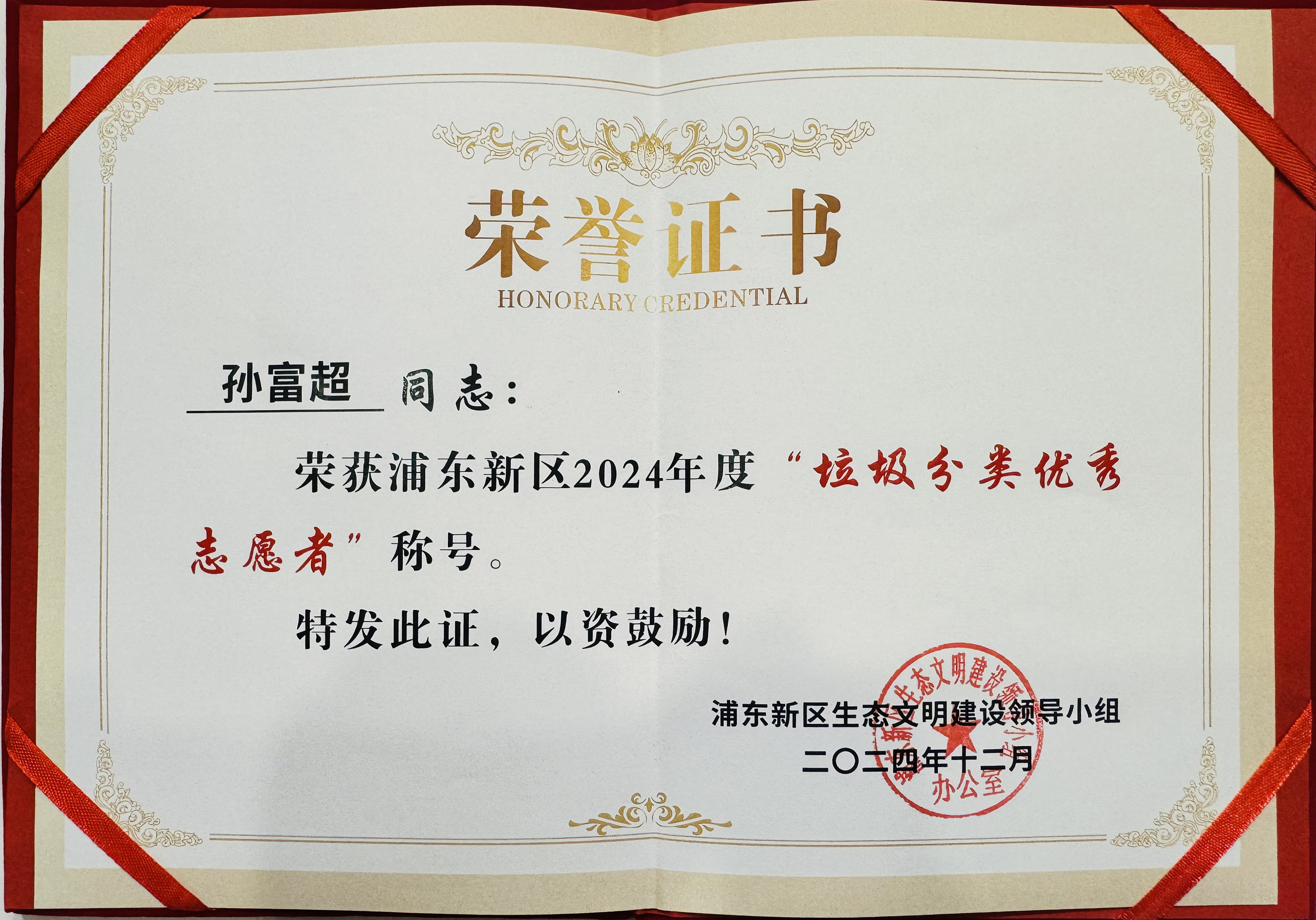 近日,宗保公司駐浦東新區陸家嘴街道社管辦小包垃圾巡查項目員工孫富超榮獲浦東新區2024年度 “垃圾分類(lèi)優(yōu)秀志愿者”稱(chēng)號。
