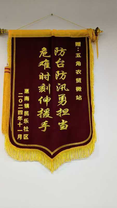 浦東新區惠南鎮五角農貿微站獲贈繡有“防臺防汛勇?lián)?危難時(shí)刻伸援手”的錦旗
