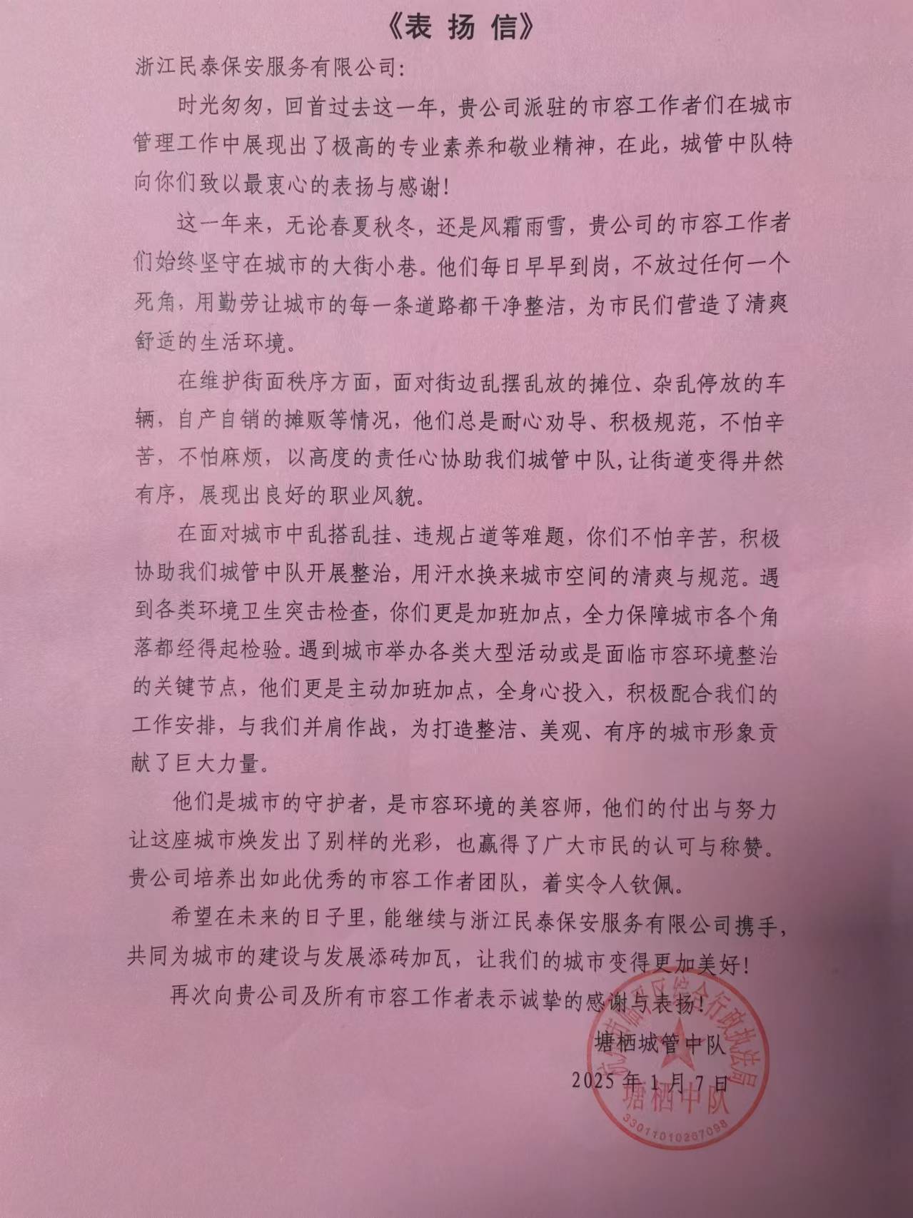 1月7日,浙江民泰公司駐杭州市臨平區塘棲城管中隊輔助項目收到塘棲城管中隊的表?yè)P信,感謝公司對塘棲城管中隊工作的大力支持和積極配合,表?yè)P公司項目員工勤懇扎實(shí)、盡心盡責,為建設美麗塘棲付出的辛勤努力。