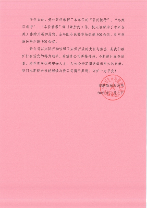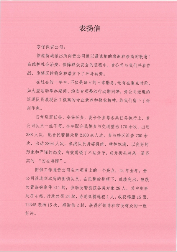 1月10日,宗保公司收到浦東新區公安分局臨港新城派出所3封表?yè)P信,感謝公司對臨港新城派出所工作的大力支持和全力配合,贊揚公司員工李鵬輝和王俊遠工作中認真負責、嚴謹細致的突出表現。