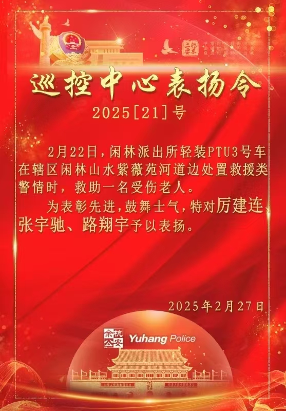 接到警情后,路翔宇與車(chē)長(cháng)厲建連、勤務(wù)隊員張宇馳驅車(chē)疾馳現場(chǎng)。在3人合力救助下,老人被成功救上岸,并被120救護車(chē)送往醫院救治。事后,民泰公司駐杭州市余杭區閑林派出所輔助項目員工路翔宇與車(chē)長(cháng)厲建連、勤務(wù)隊員張宇馳受到余杭區公安分局巡控中心的通報表?yè)P。
