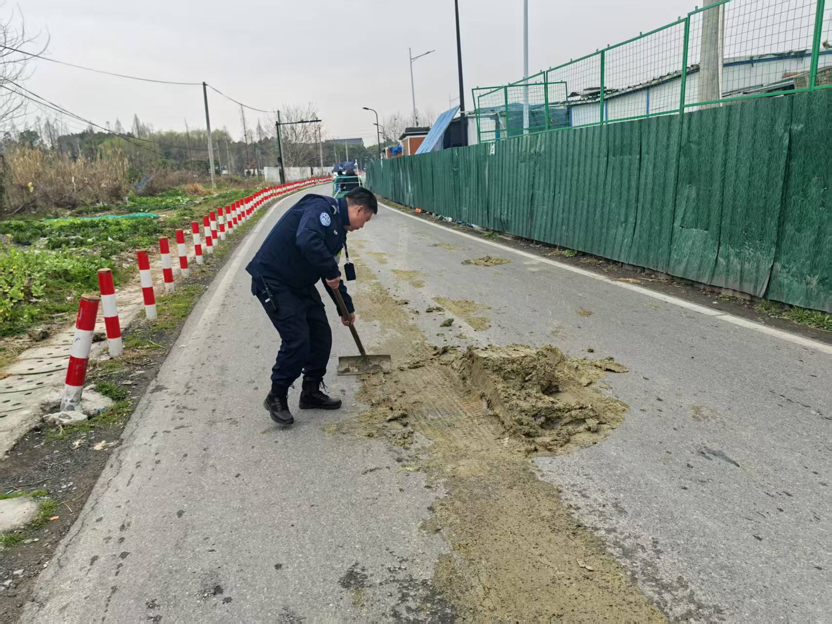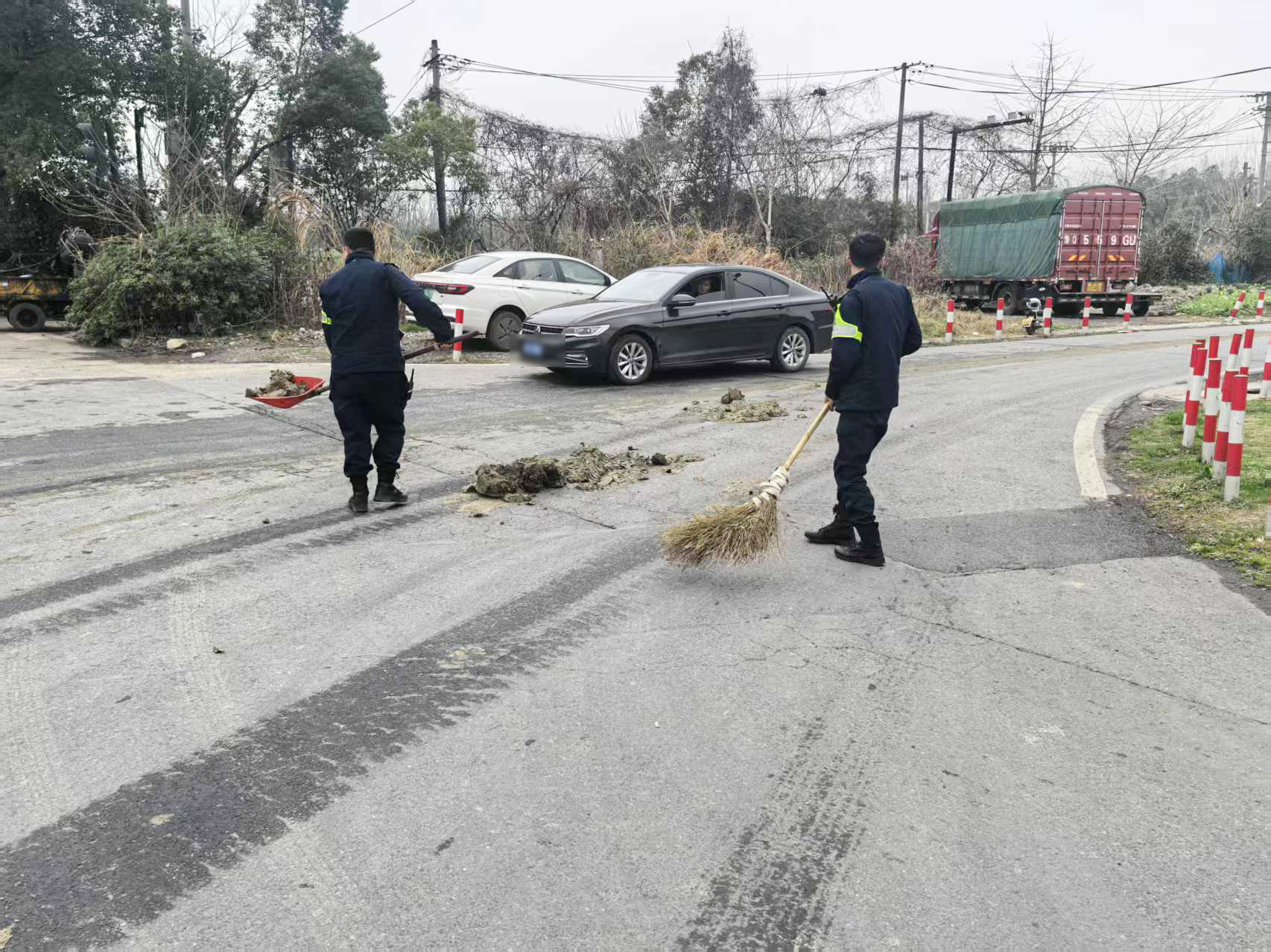 3月5日,浙江民泰公司駐杭州市余杭區良渚新城派出所輔助項目員工齊心協(xié)力清理路面散落黏土,保障道路通行安全。