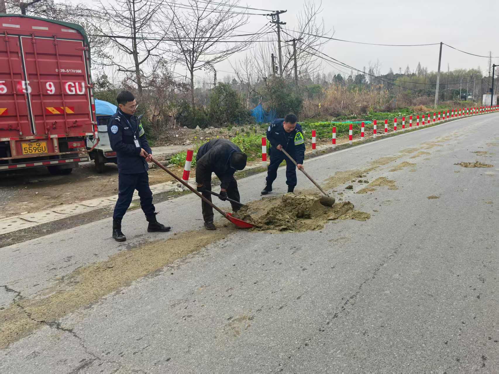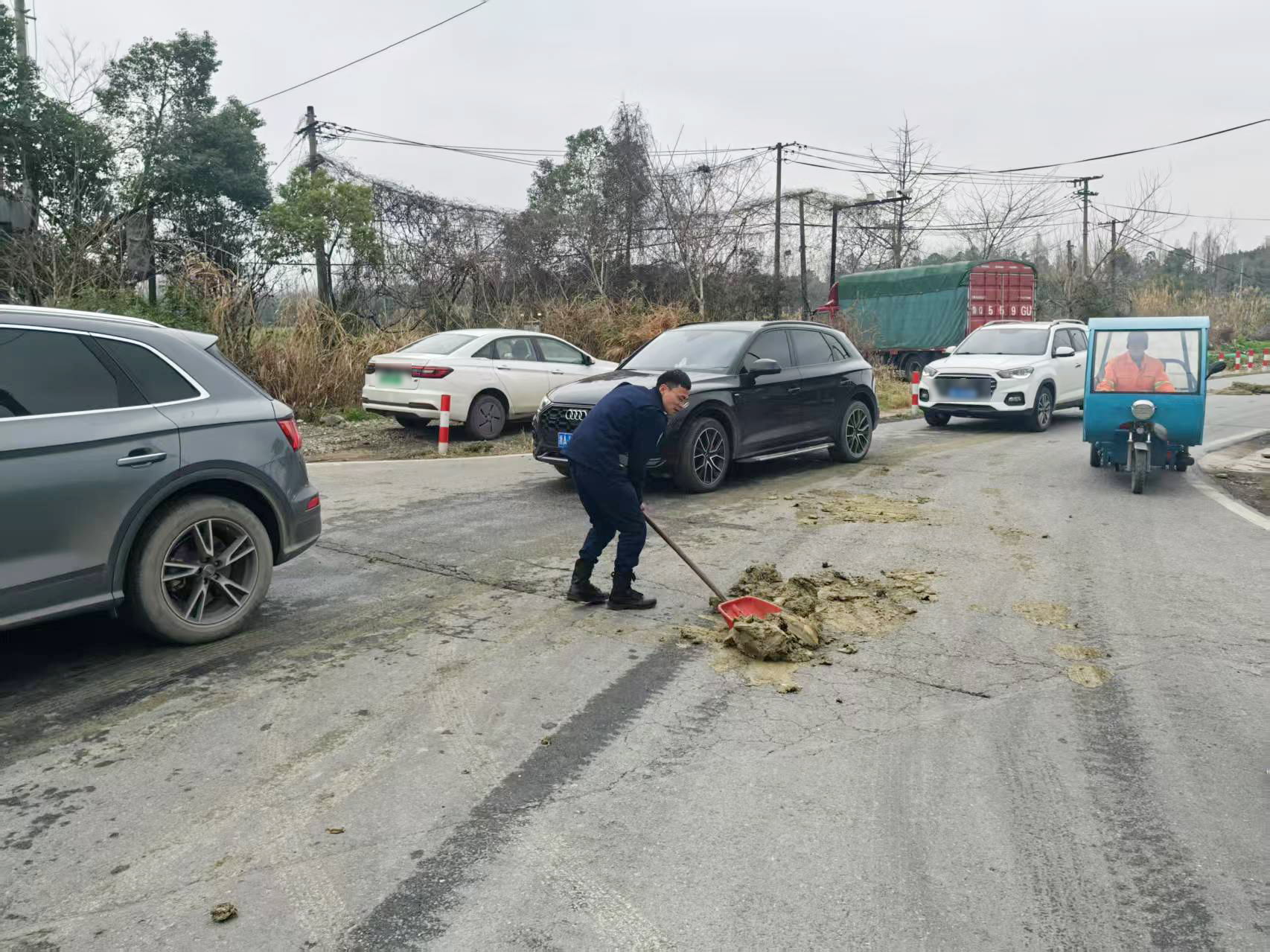 面對這一緊急情況,巡車(chē)長(cháng)張正富迅速做出反應,站在路口指揮交通,確保車(chē)輛能夠有序通行,有效防止事故的發(fā)生。與此同時(shí),公司員工賈雙諭和隊員周軍也在第一時(shí)間行動(dòng)起來(lái),他們在周?chē)O置了警示區域并放置警示標識以提醒路人注意安全,隨后從附近停車(chē)場(chǎng)借來(lái)了鐵鍬、鐵耙等必要的清理工具,投入到緊張的清理工作中去。