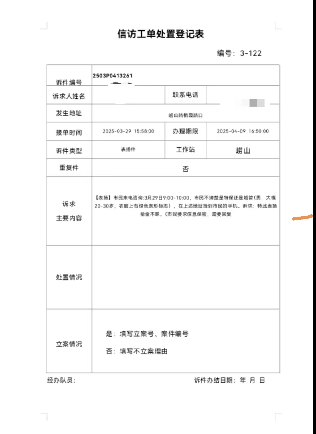 3月31日16:20,宗保公司駐浦東新區周浦市容項目員工田紅開(kāi)在年家浜路巡查時(shí),撿到一部紫色華為手機??紤]到失主可能會(huì )返回尋找,就在原地邊值勤邊等待。