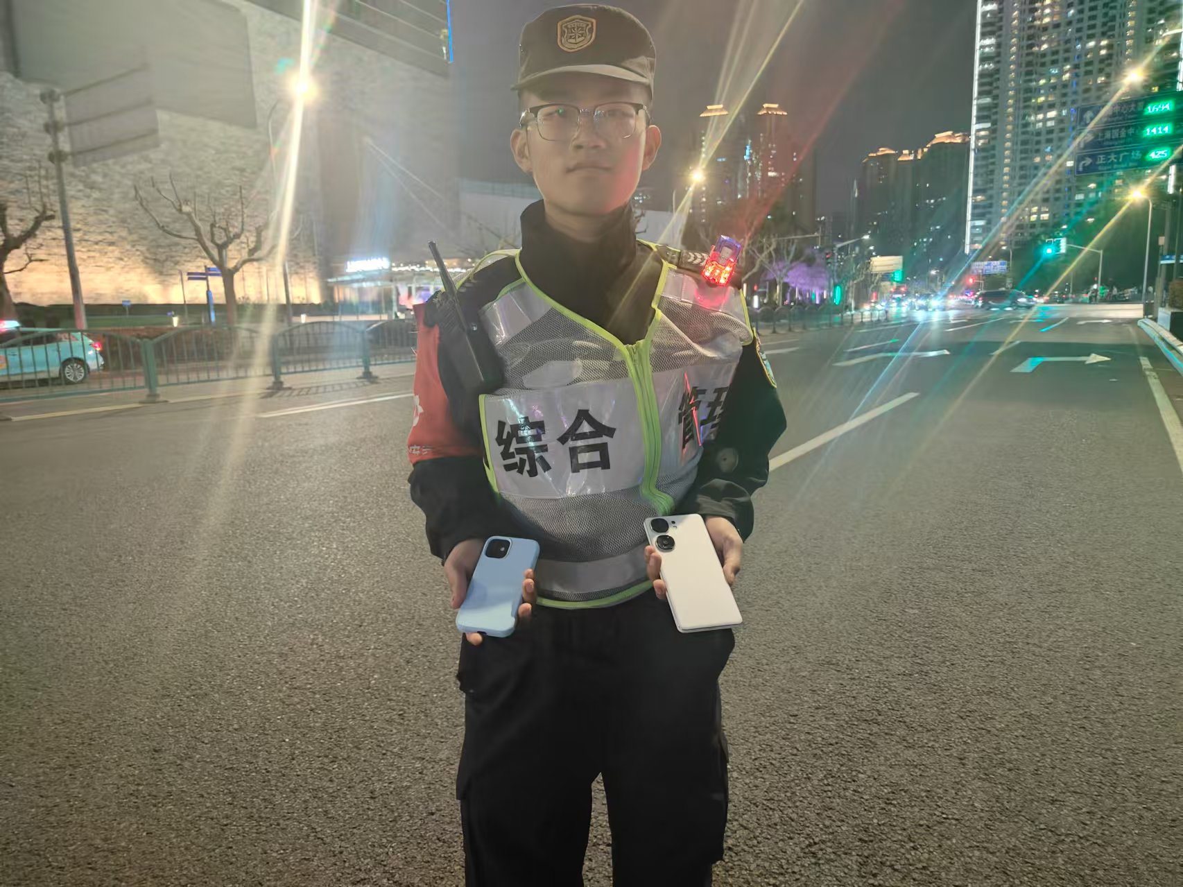 4月5日21:20,宗保公司駐浦東新區陸家嘴綜合管理項目員工高貴玉在東泰路金茂大廈2號門(mén)附近巡邏時(shí),撿到一部蘋(píng)果手機和一部IQOO手機,報告班組長(cháng)后,便在原地邊值勤邊等待失主。