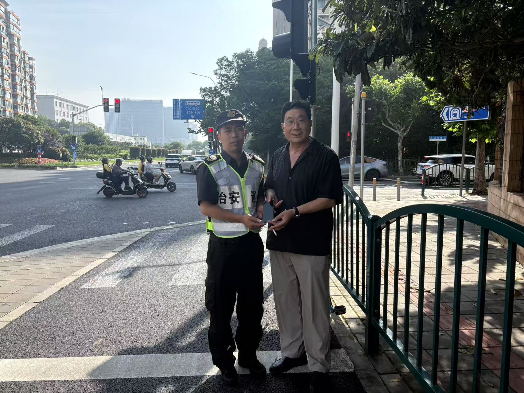 6月12日17:40,浙江民泰公司駐杭州市余杭區五常街道市容項目員工李天浩和牟倫申在五常街道荊長(cháng)路與天竺路交叉口執勤時(shí),撿到一部VIVO手機,隨即報告了帶班組長(cháng),并在原地邊執勤邊等待失主。