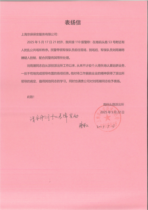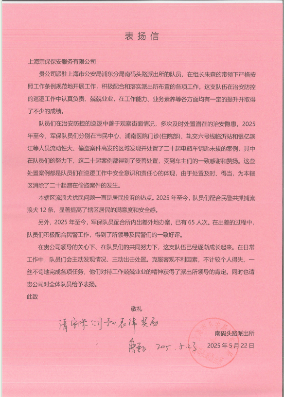5月22日,宗保公司駐浦東新區南碼頭派出所輔助項目收到派出所的表?yè)P信,表?yè)P項目組長(cháng)朱森,愛(ài)崗敬業(yè)、任勞任怨,素質(zhì)過(guò)硬、責任心強,團結帶領(lǐng)公司項目員工嚴格遵守派出所各項管理規定,全力配合派出所做好治安巡邏工作的優(yōu)異表現。(供稿人:康占峰)