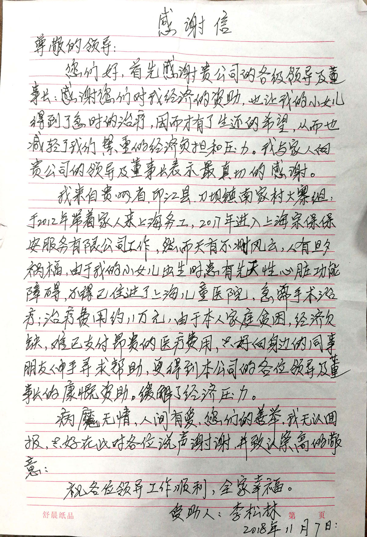原來(lái),今年2月李松林與愛(ài)人生了一個(gè)女兒。孩子剛剛出生,就查出患先天性心臟病。3月份,在上海兒童醫學(xué)中心動(dòng)了第一次手術(shù)。高額的手術(shù)費不僅花光了夫妻的積蓄,還讓他們背上不少債務(wù),使這個(gè)本就不富裕的家庭更是雪上加霜。11月份的第二次手術(shù)迫在眉睫,“錢(qián)從哪里出”成了小李全家翻不過(guò)去的大山。