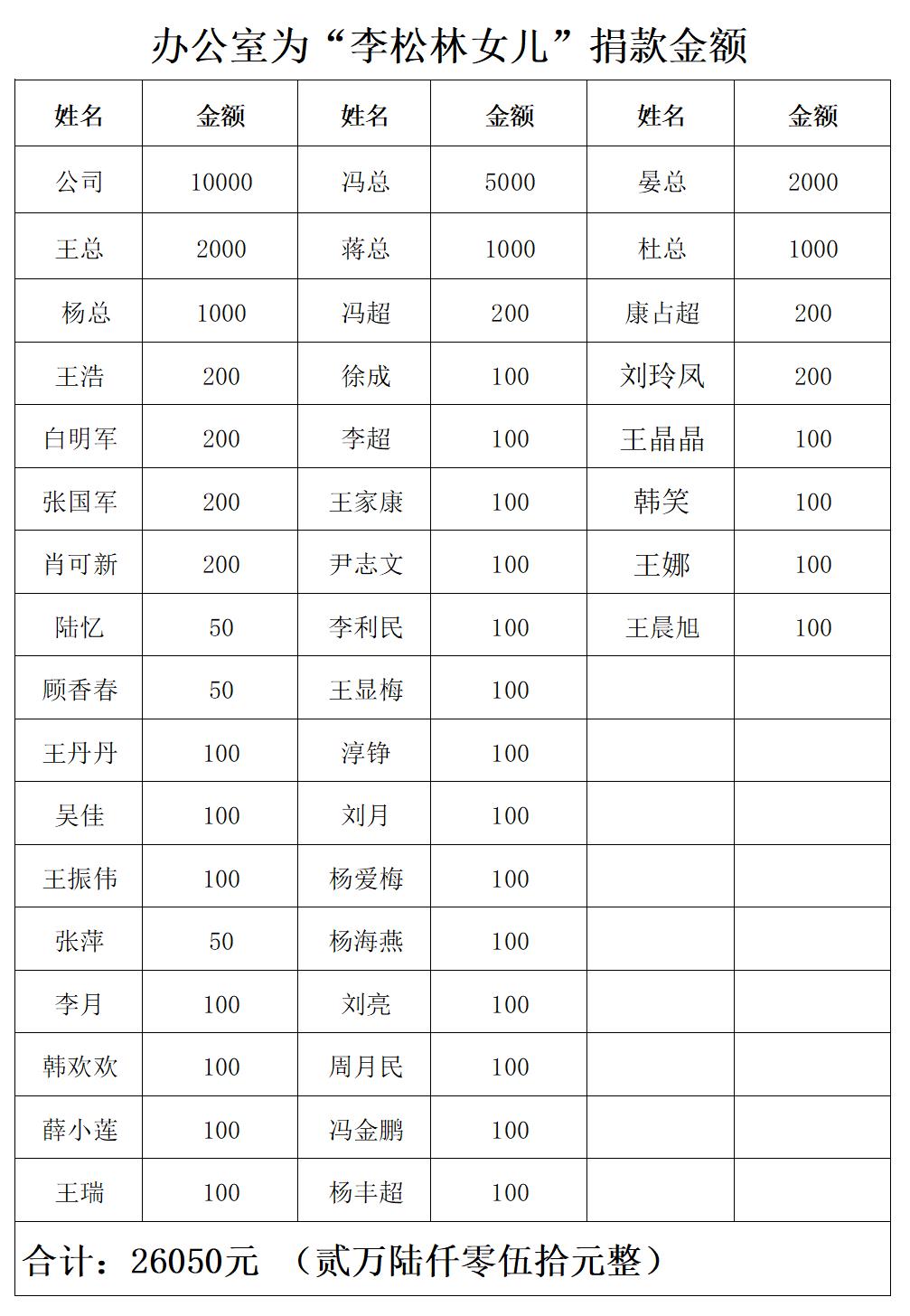 涓涓細流可以流淌成浩瀚大海,點(diǎn)滴愛(ài)心可以匯聚成愛(ài)的洪流。今天大家的愛(ài)心將會(huì )化作李松林全家堅強的動(dòng)力和明天的希望。此次捐款活動(dòng)充分體現了宗保公司廣大員工團結友愛(ài)、互幫互助的美德;彰顯了宗保公司奉獻、友愛(ài)、互助、進(jìn)步的時(shí)代新風(fēng)。我們堅信:只要人人都獻出一點(diǎn)愛(ài),世界將變成美好的人間。