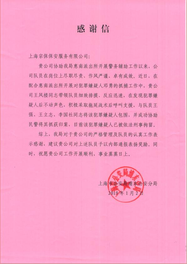 2019年1月2日,新年上班第一天,宗保保安公司收到來(lái)自于上海市公安局浦東分局的一封感謝信。