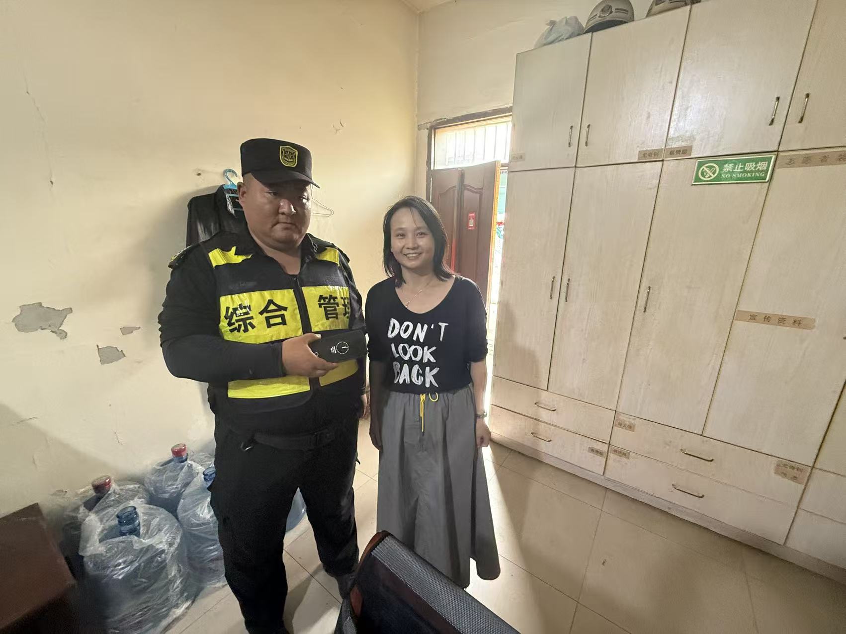 很快,一位身穿藍色防曬衣的女士趕到現場(chǎng)。韋日成通過(guò)女士指紋解鎖手機,確認其是失主后,就把手機歸還給了她。女士拿到手機非常高興,連連稱(chēng)贊宗保員工拾金不昧的助人行為。