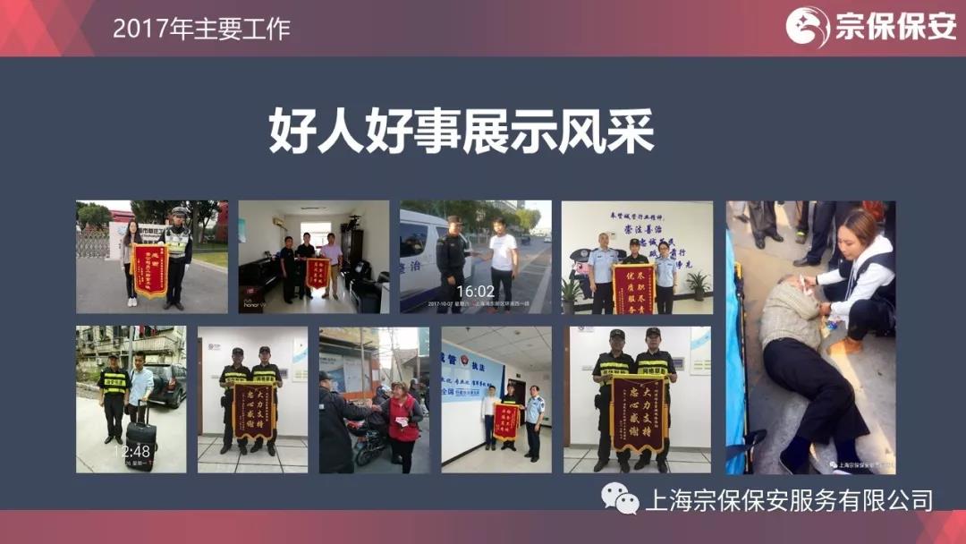 2017年8月9日,陸家嘴城管項目隊員馬立翔在工作過(guò)程中,撿到價(jià)值8萬(wàn)多元的白金鉆戒,毫不猶豫交給民警找到失主一下子成為網(wǎng)紅小哥。馬立翔只是無(wú)數宗保好人的一個(gè)具體代表。2017年,全公司共交還遺失財物30多萬(wàn)元,拒收賄賂20多萬(wàn)元,找回走失兒童8人,400多人次打不還手、罵不還口,堅持文明值勤?!吧蠉徧峁┓?wù),微笑增添力量,刁難接受考驗,忍辱造就和諧”的服務(wù)理念已經(jīng)深深烙在每一名宗保人的心中。