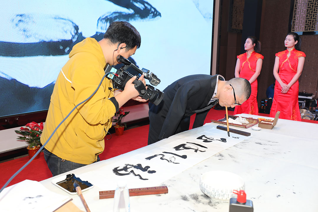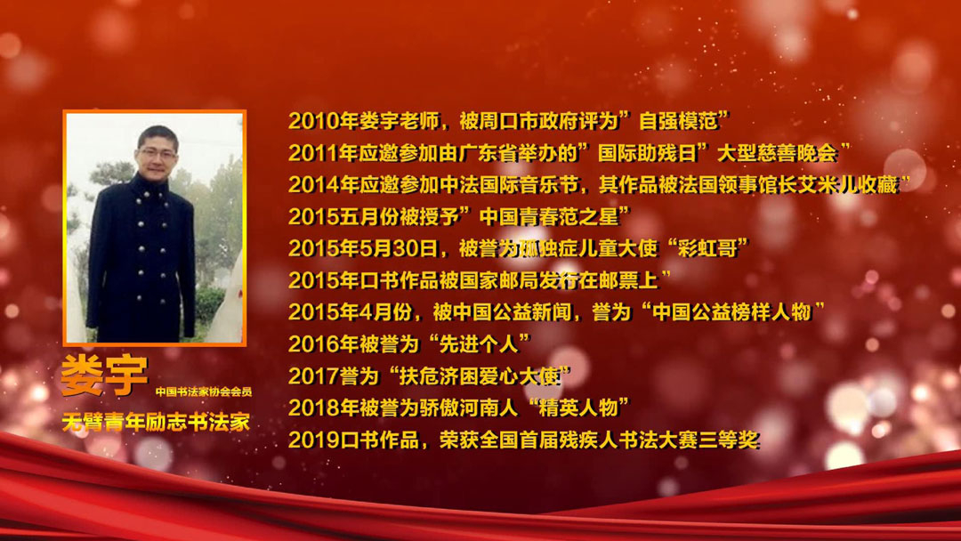晚會(huì )現場(chǎng)特邀著(zhù)名的青年勵志書(shū)法家?jiàn)溆钕壬桥_互動(dòng)。婁宇先生是北京書(shū)法家協(xié)會(huì )會(huì )員、“中國青春范之星”,他用嘴執筆現場(chǎng)表演書(shū)法?,F場(chǎng)所有人自發(fā)起立,為其鼓掌、叫好。